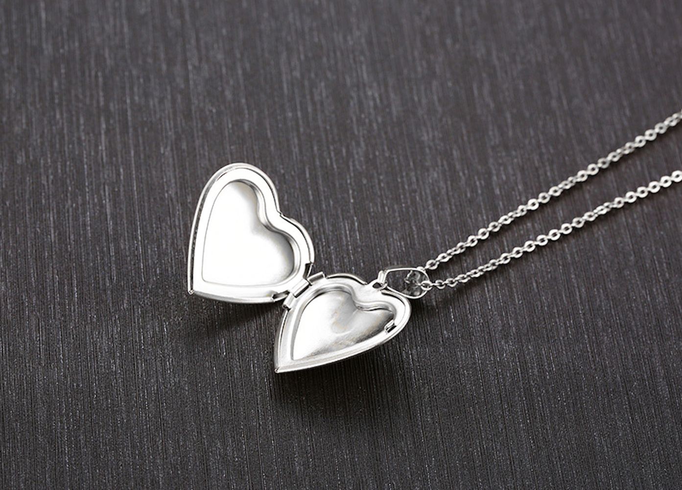 Le médaillon est en acier inoxydable poli, avec une forme de cœur aux courbes douces et une belle épaisseur en main. Il s'ouvre grâce à une charnière latérale solide pour accueillir une petite photo à l'intérieur. La finition miroir lui donne un éclat argenté élégant, résistant à l'eau et à l'usure du quotidien. Il est suspendu à une chaîne fine en acier, légère et confortable à porter.