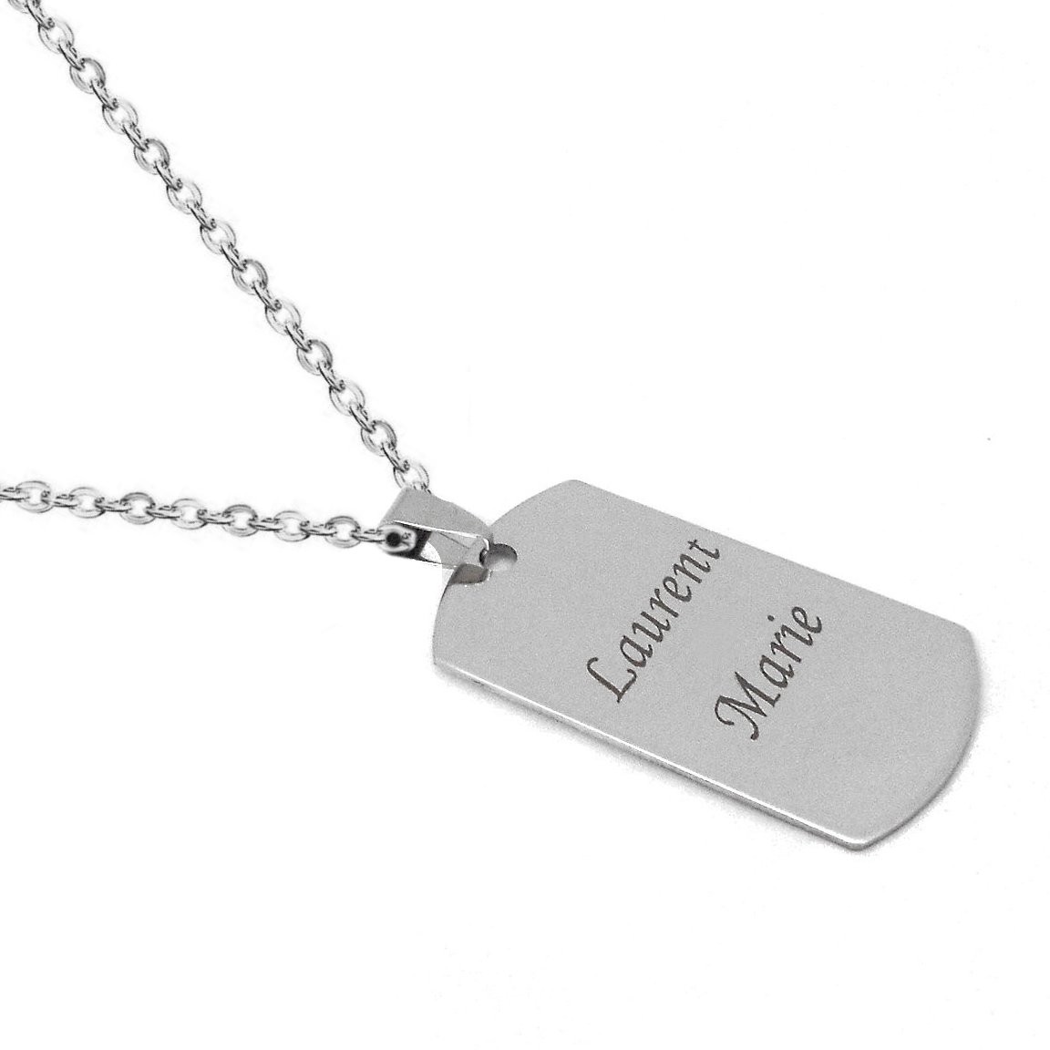 La plaque est en acier inoxydable poli, avec des coins légèrement arrondis et une belle épaisseur en main. La finition miroir lui donne un rendu élégant, loin de l'aspect cheap de certains bijoux gravés. Elle est suspendue à une chaîne fine en acier, solide et résistante au quotidien — à l'eau, à la transpiration, à l'usure du temps.