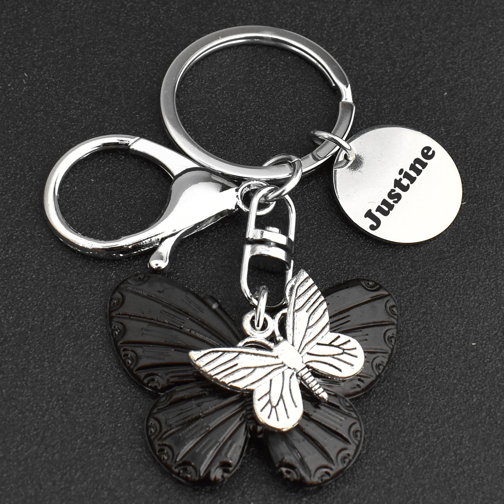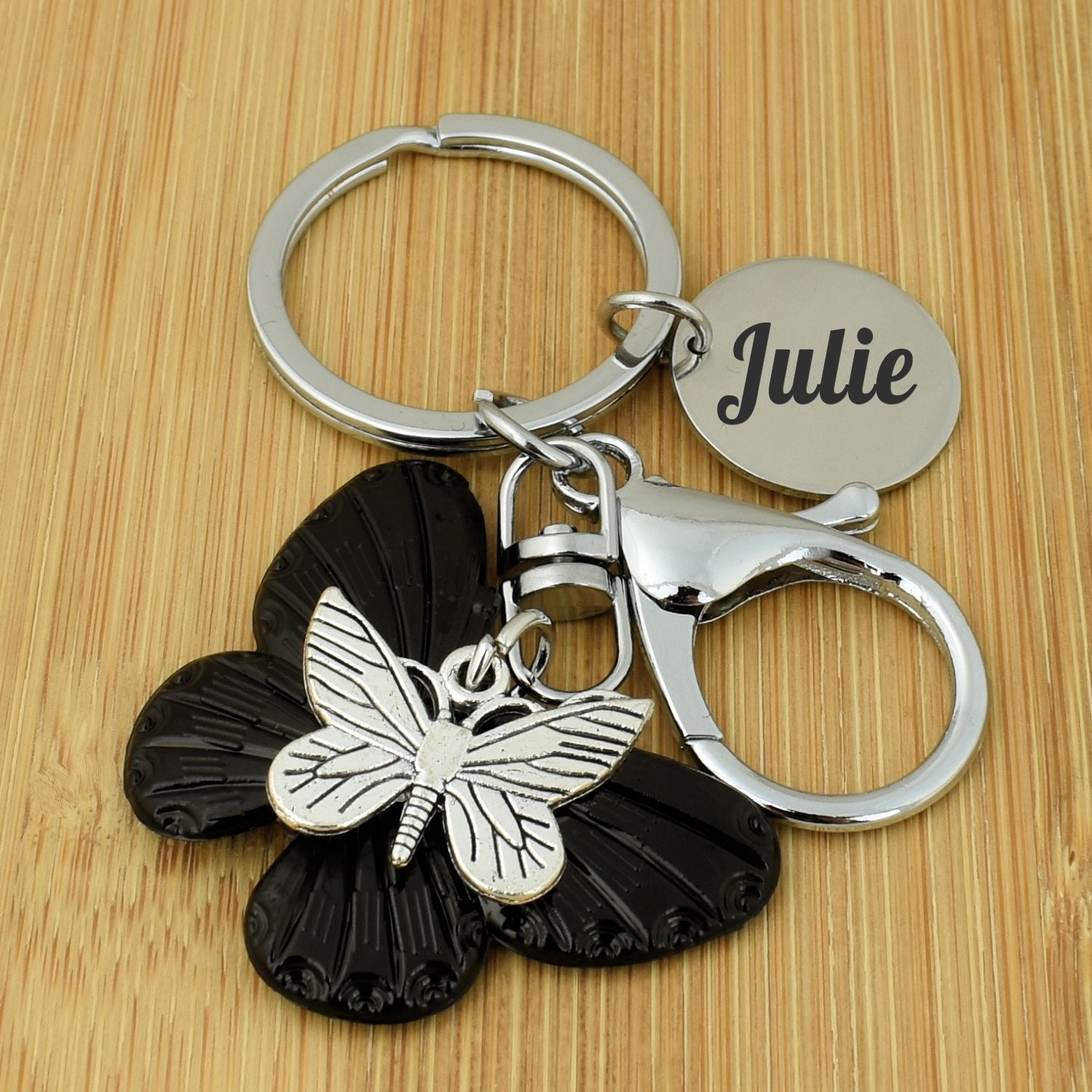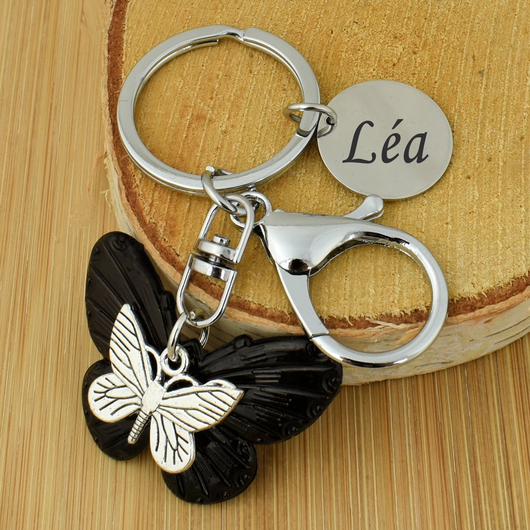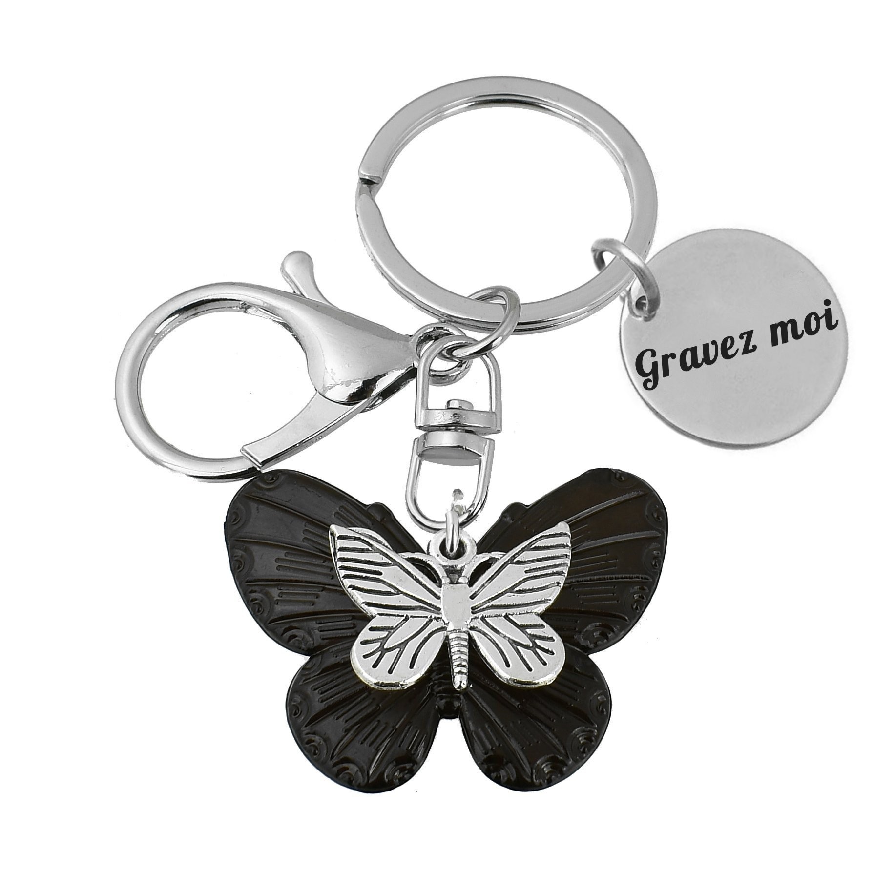 Porte-clés Papillon gravé — Bijou de Sac Noir Argenté Cadeau Femme Personnalisé