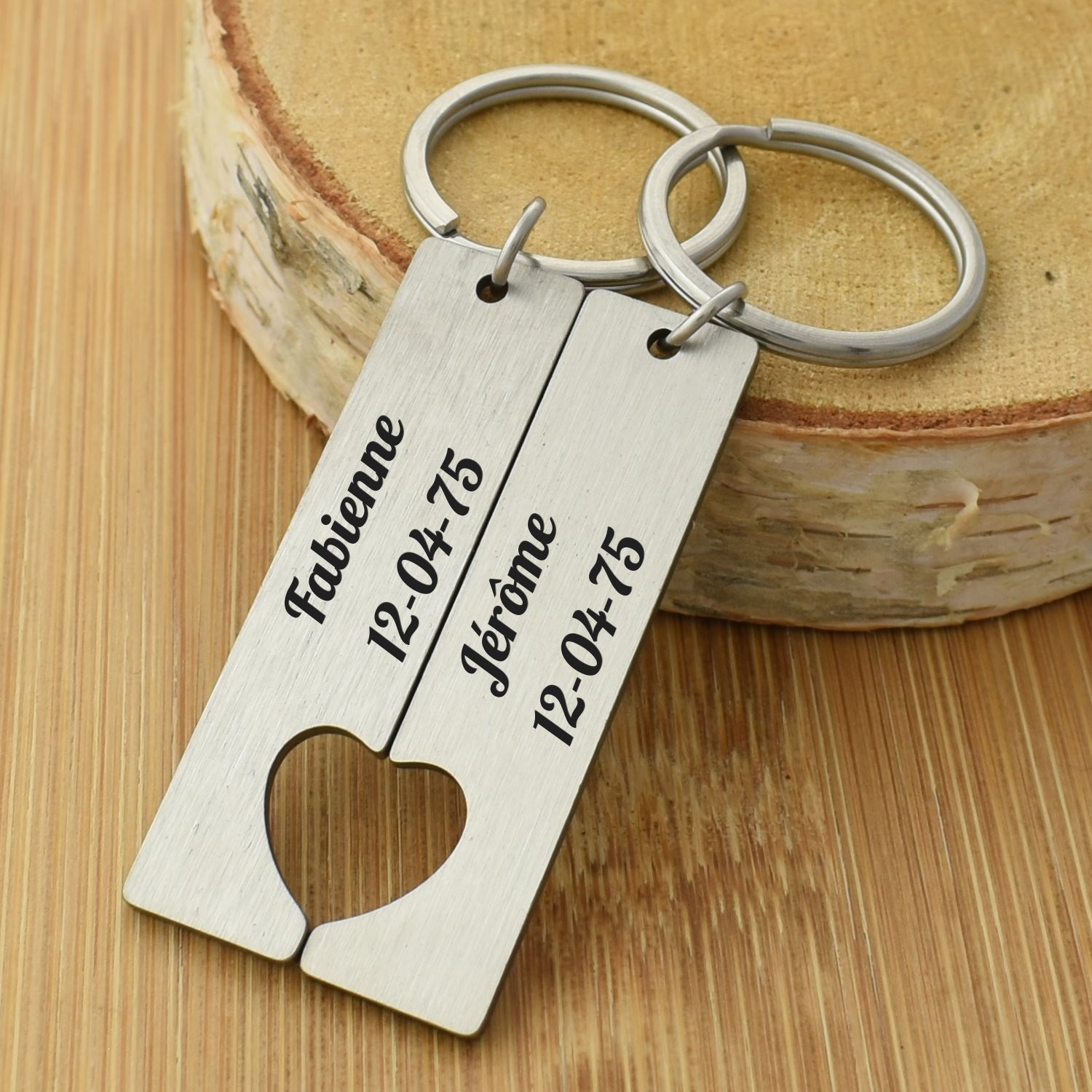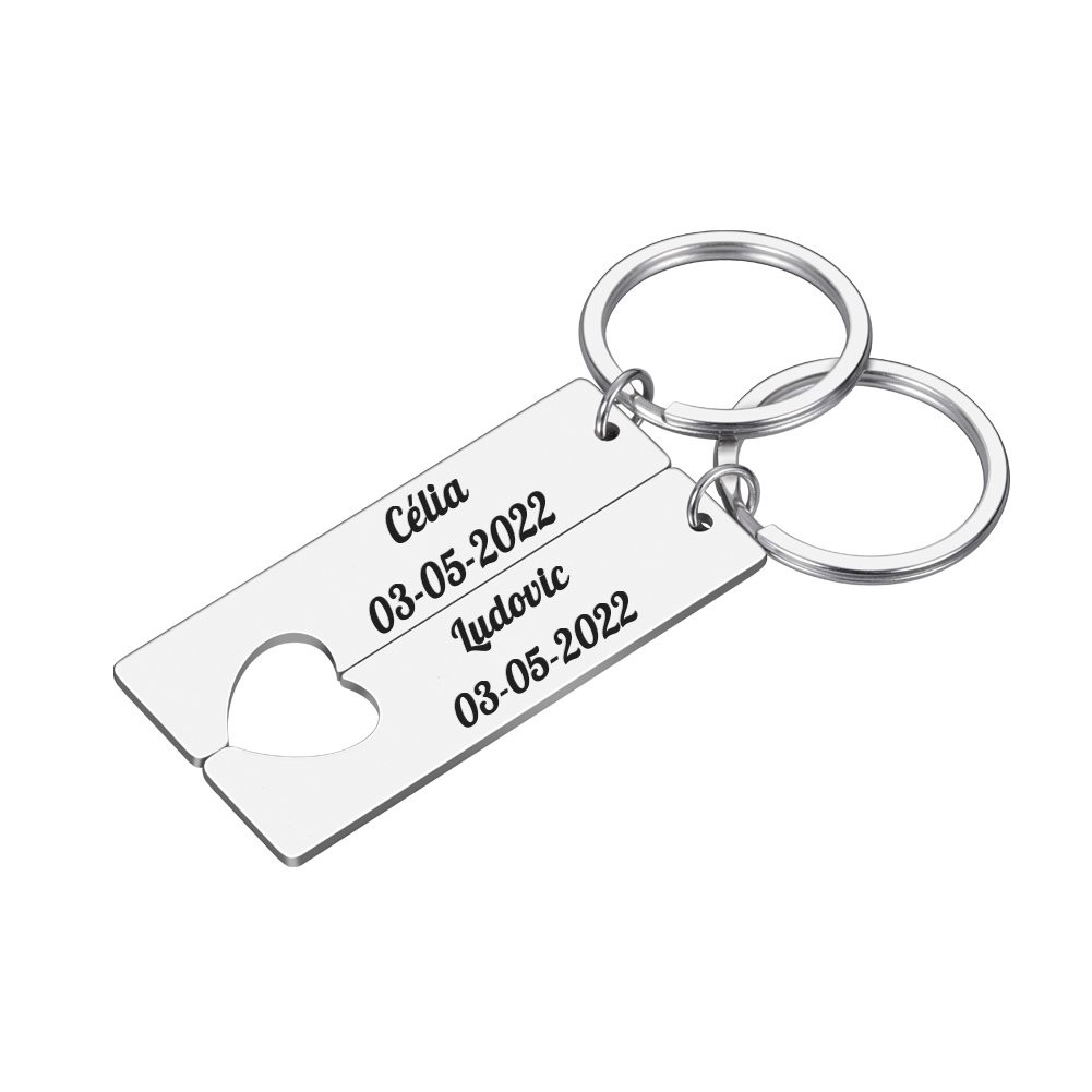 Porte-clés Demi-Cœur Couple Personnalisé Gravé – Lot de 2 Acier – Cadeau Saint-Valentin ou Anniversaire