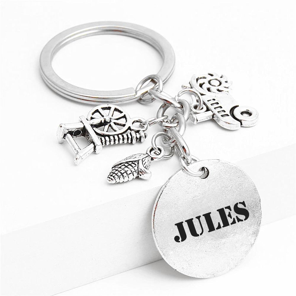 Le porte-clés réunit quatre breloques accrochées au même anneau : un tracteur miniature avec roues dentées bien détaillées, une charrue à soc, un épi de maïs aux grains finement ciselés, et le médaillon rond gravable — le tout en métal argenté vieilli avec une belle patine qui renforce le caractère authentique et terrien de l'ensemble. Solide et résistant à l'usage quotidien, même dans les environnements difficiles.
