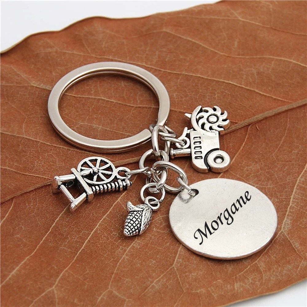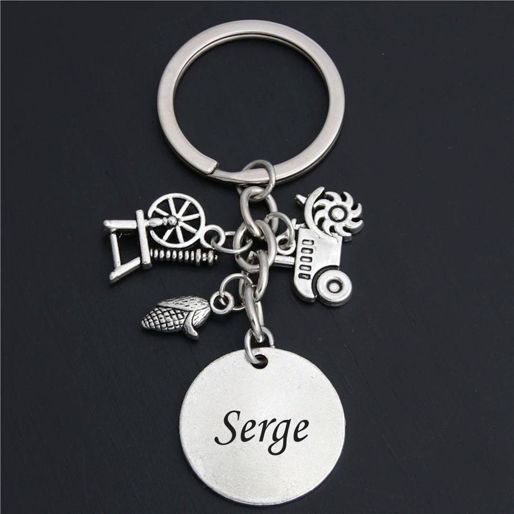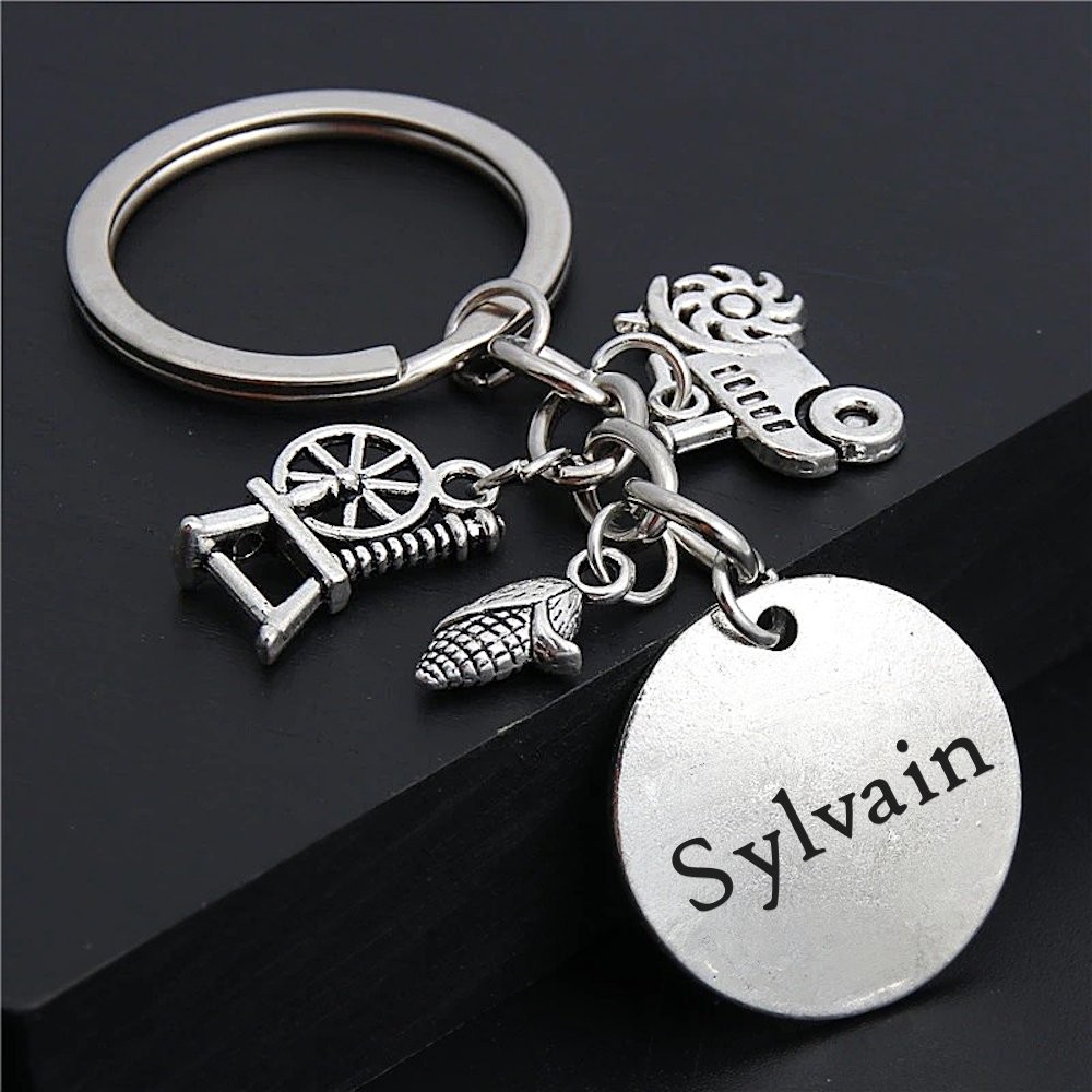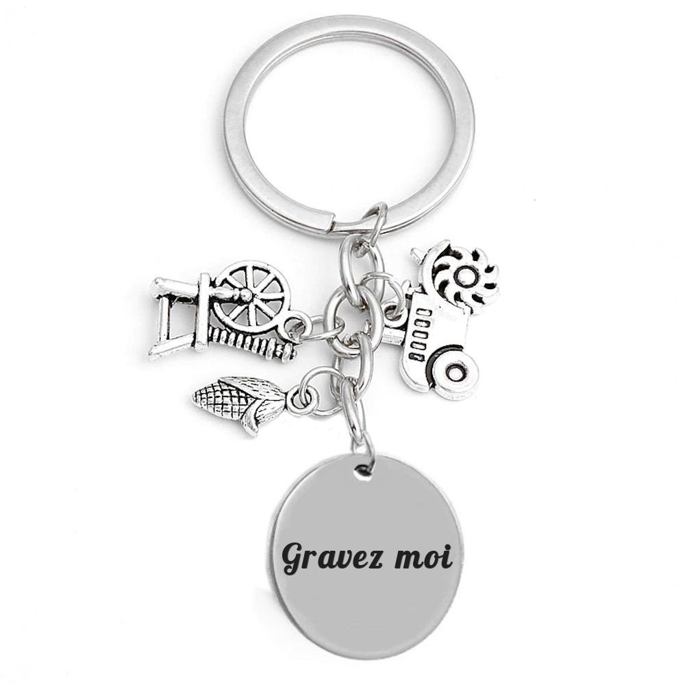 Porte-clés Agriculteur gravé — Tracteur Charrue Maïs Cadeau Agriculture Personnalisé