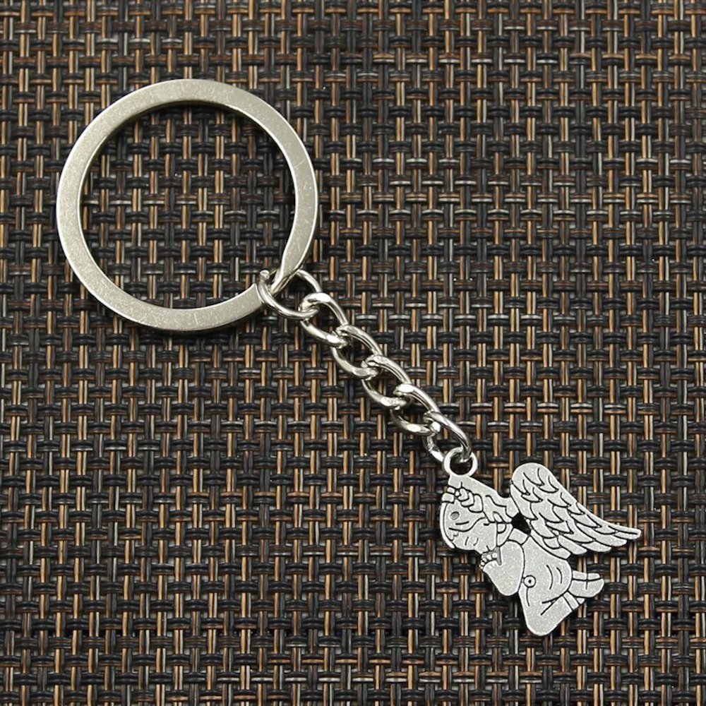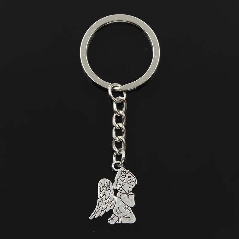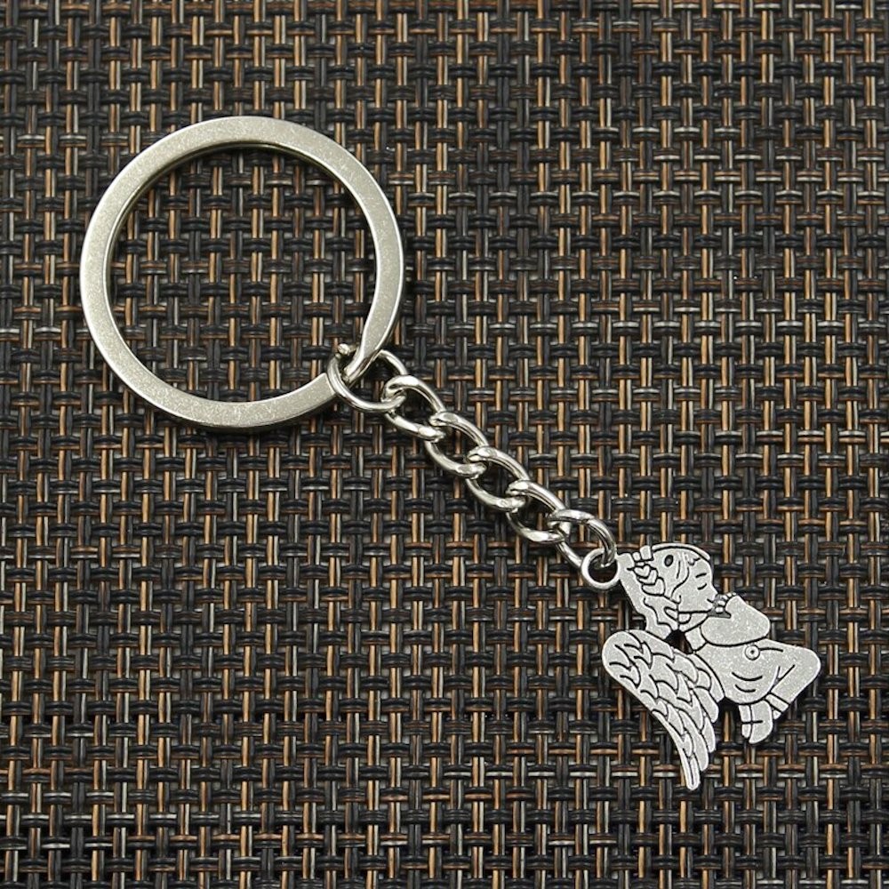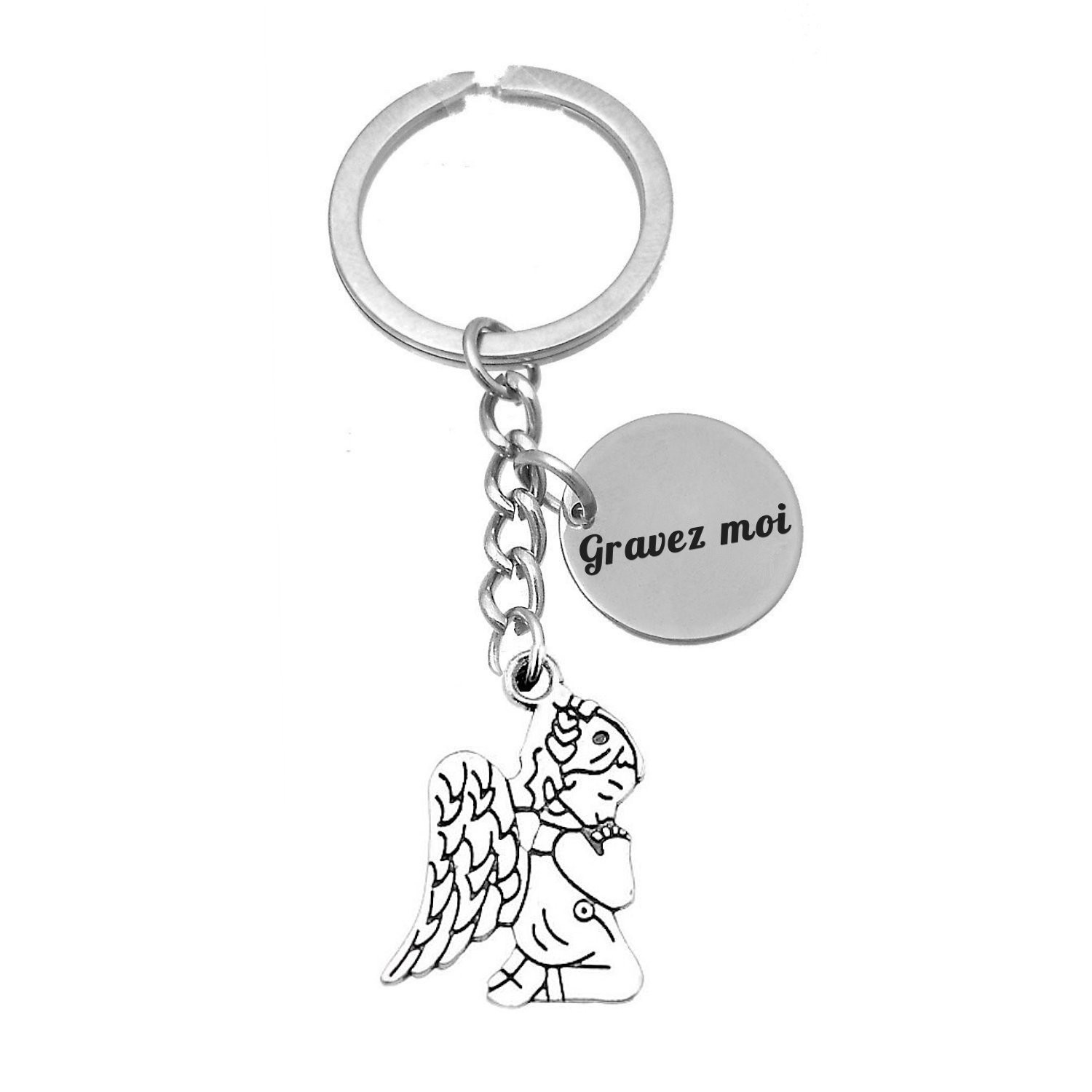 Le pendentif représente un angelot enfant agenouillé en position de prière, grandes ailes déployées derrière lui, tête levée vers le ciel — finement ciselé en métal argenté vieilli avec une patine sombre dans les creux qui renforce le caractère recueilli et délicat de la pièce. Le médaillon gravable est relié par une petite chaîne à l'anneau de trousseau, positionné sur le côté. Résistant à l'humidité et à l'usure du quotidien sans entretien particulier.