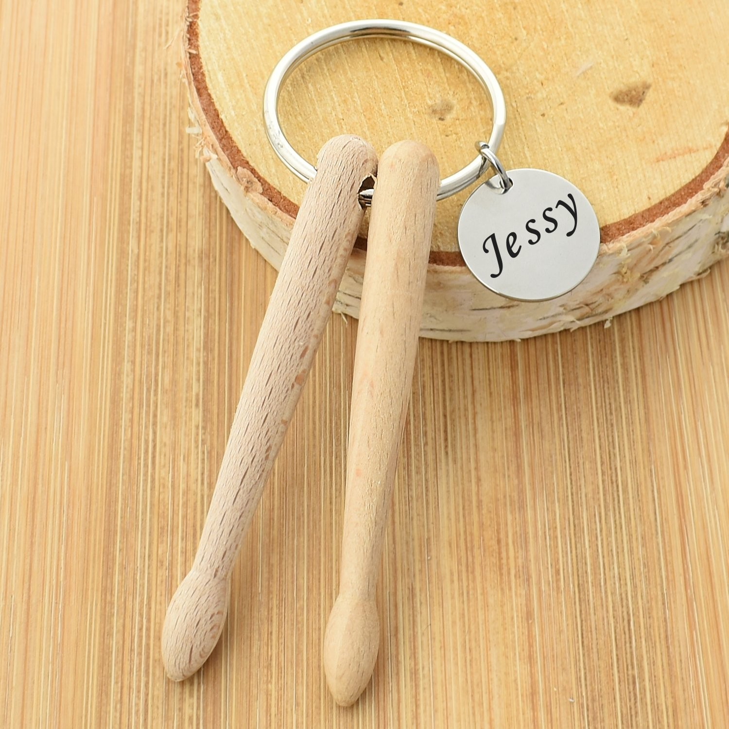 Le porte-clés comprend deux vraies petites baguettes de batterie en bois naturel clair — pas une représentation en métal, de vraies baguettes miniatures avec leur forme caractéristique, leur olive à l'embout et leur grain de bois visible — accrochées à l'anneau de trousseau aux côtés du médaillon gravable en métal argenté. Le contraste bois brut et métal poli donne à l'ensemble un aspect authentique et bien fini, solide pour une utilisation quotidienne.