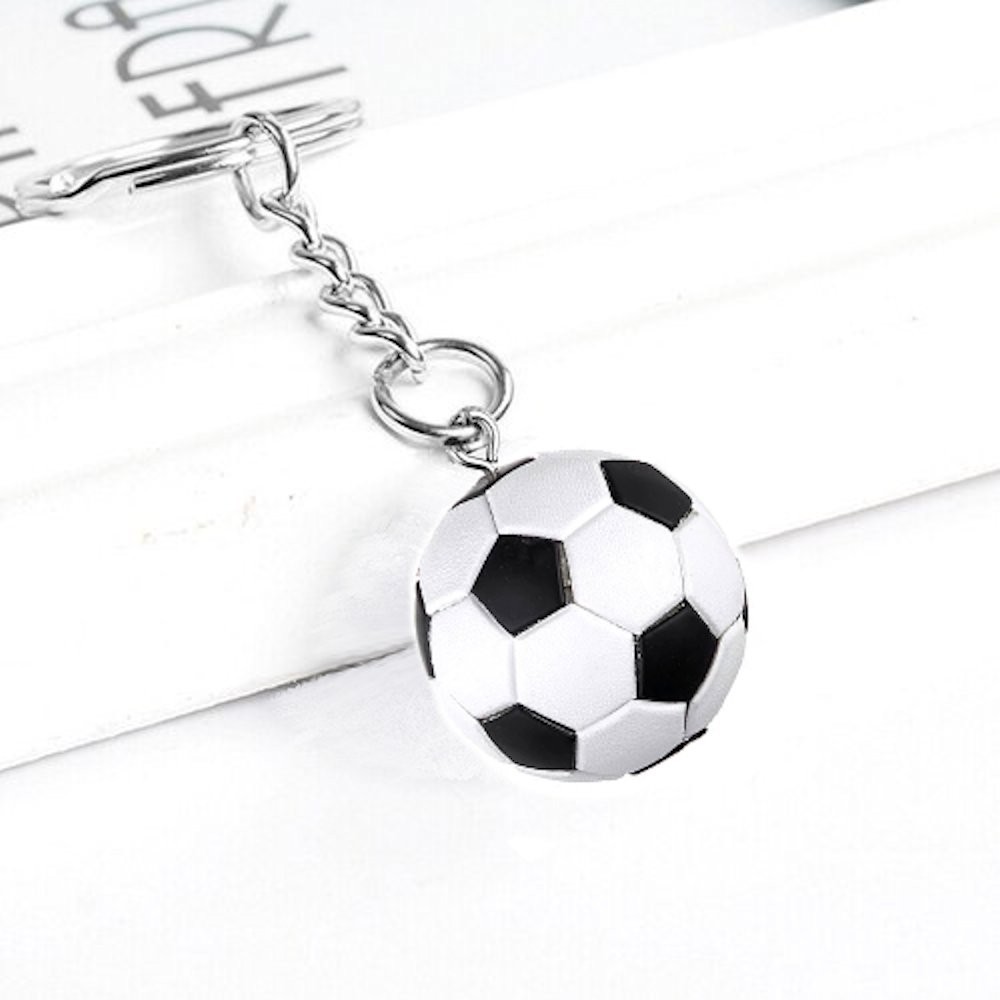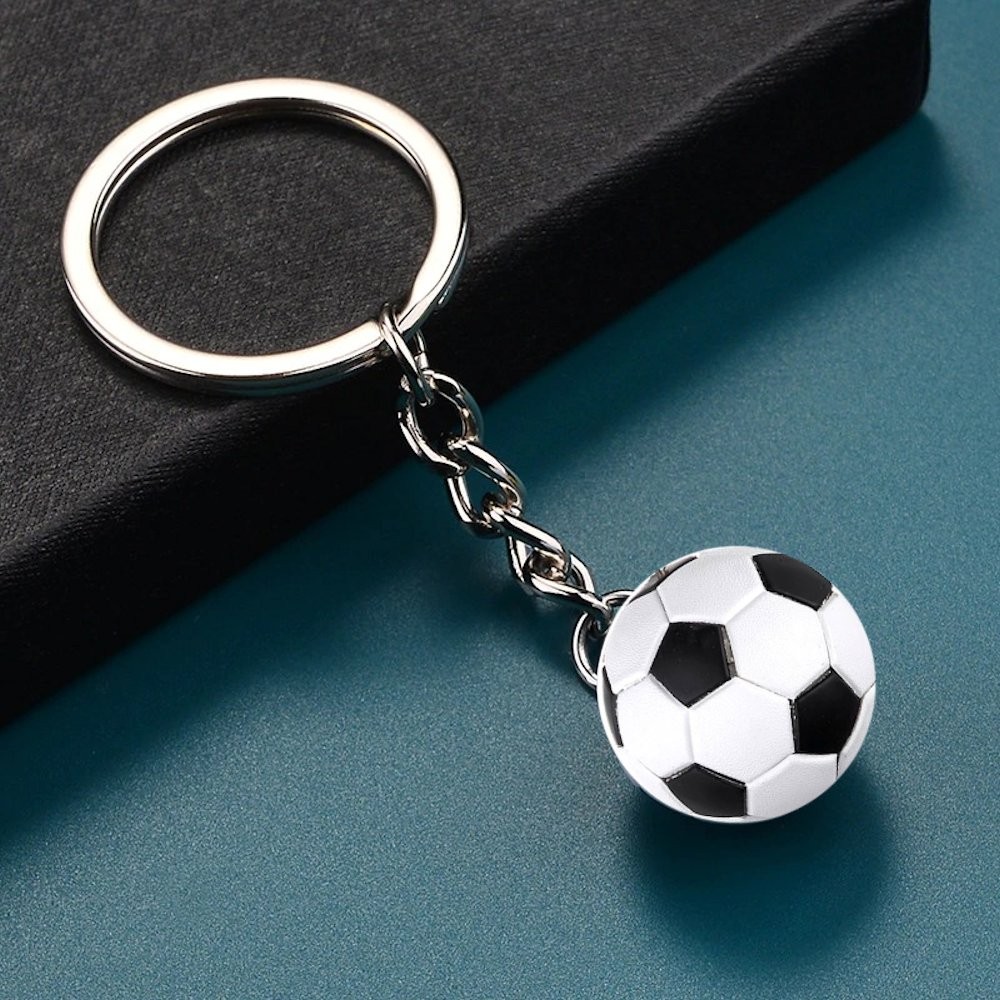 Le pendentif principal est un ballon de football en métal argenté, reproduit avec ses pentagones noirs et blancs caractéristiques. Il est accompagné d'une médaille ronde en acier inoxydable, à la finition polie et brossée. Le tout est fixé sur un anneau argenté solide avec une chaîne à maillons résistante. L'ensemble est conçu pour durer des années sur un trousseau de clés, au quotidien.