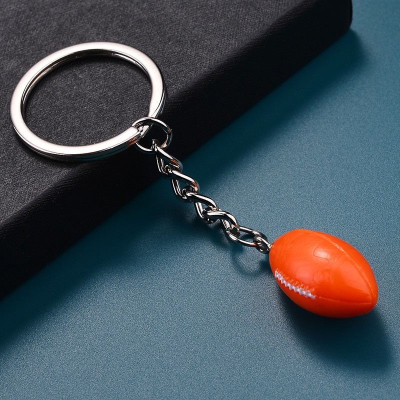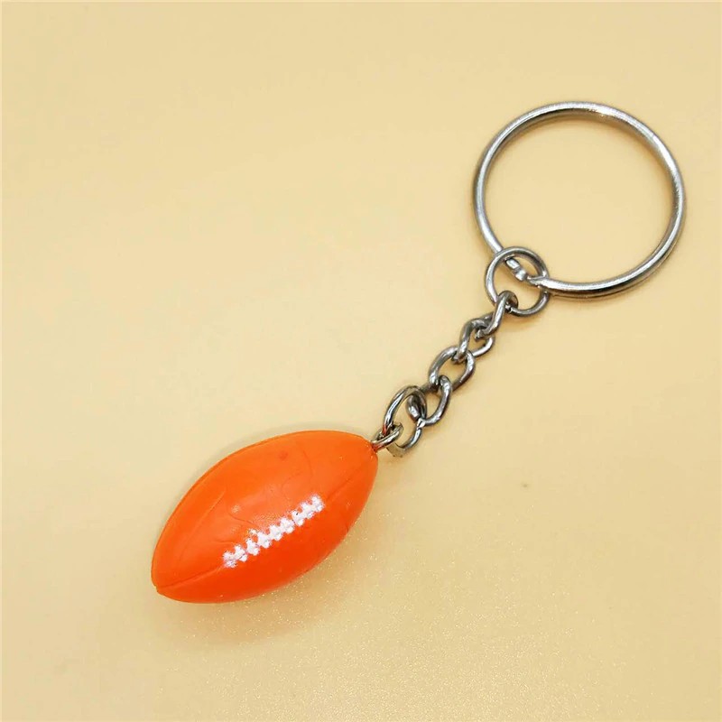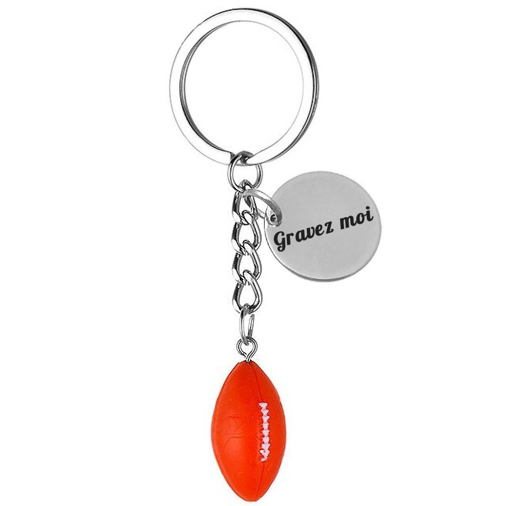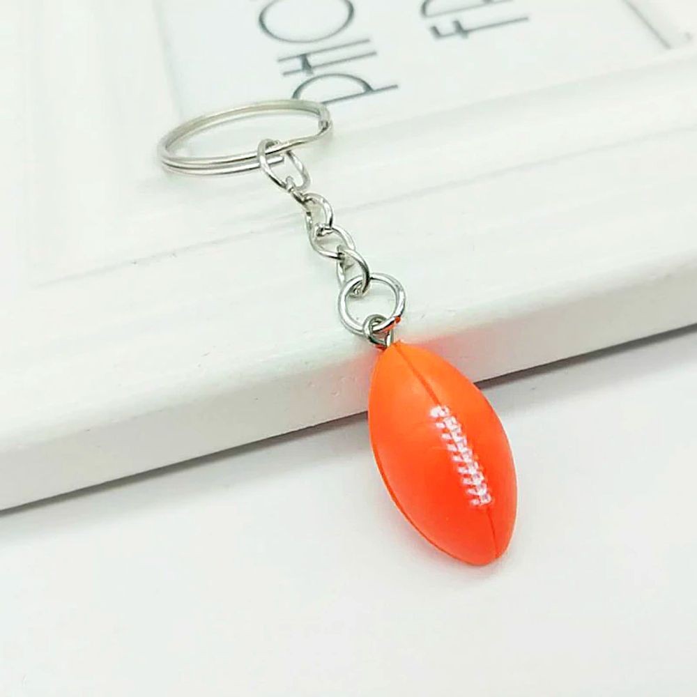 Le pendentif est une miniature réaliste de ballon de rugby en résine moulée orange vif — forme ovale parfaitement proportionnée avec coutures blanches et relief de la peau du ballon bien rendus. La couleur orange tranchante et le volume en 3D lui donnent un rendu immédiatement reconnaissable et visuellement généreux, bien différent des pendentifs plats en métal. L'ensemble est monté sur un anneau porte-clés standard avec chaîne intermédiaire et médaille gravable accrochée à côté. Le métal de l'anneau et de la chaîne résiste bien aux frottements et à l'usure du quotidien.