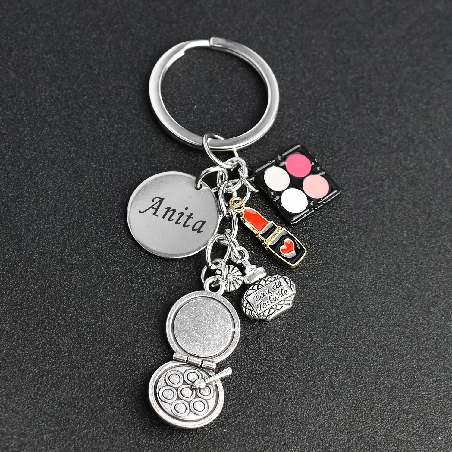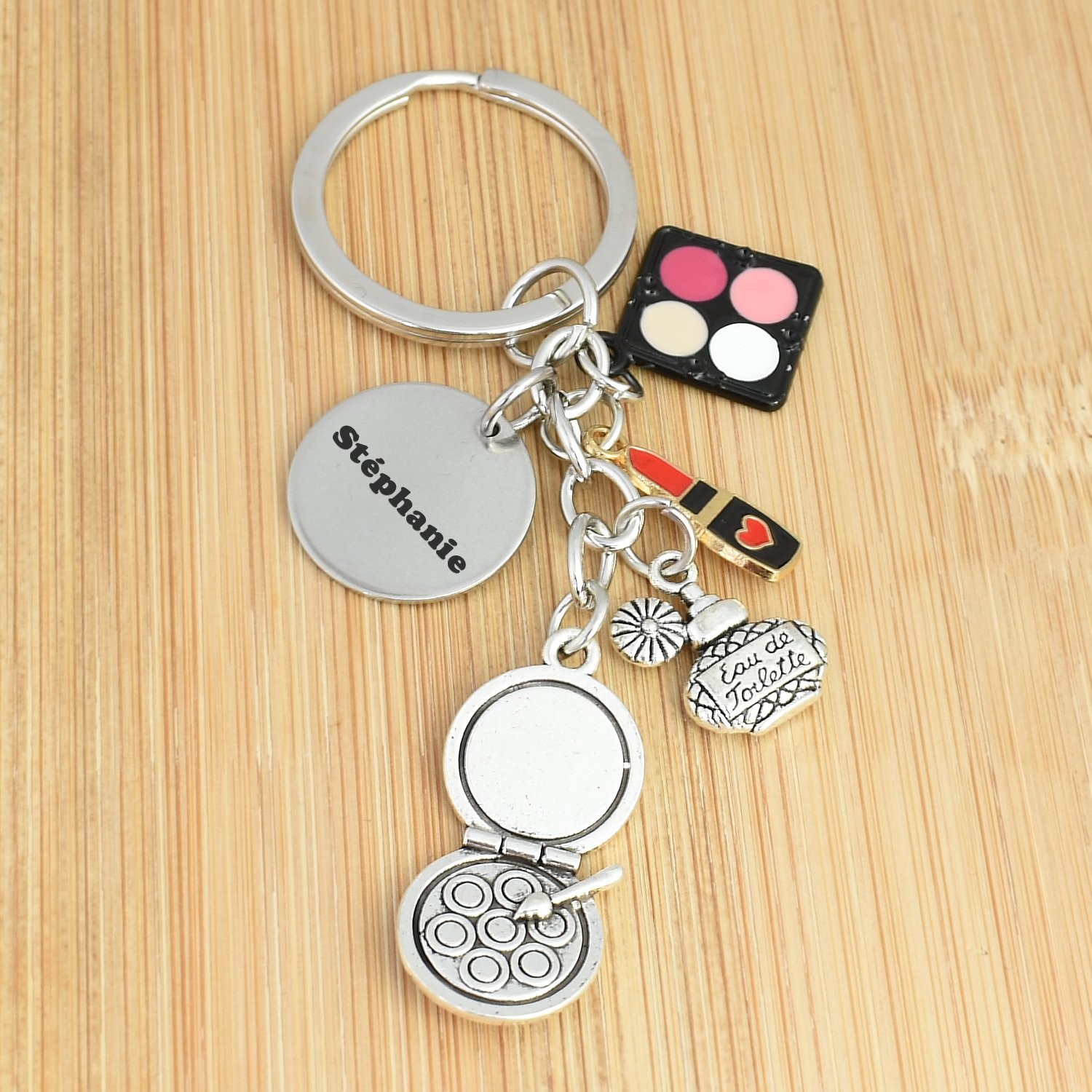 Tu cherches un cadeau pour quelqu’un qui ne sort jamais sans son rouge à lèvres, qui connaît chaque palette par cœur et qui vit pour le maquillage et les soins ? Le porte-clés Beauté gravé — poudrier, palette, rouge à lèvres, parfum et médaille — est fait pour les passionnées de cosmétiques et d’esthétique. Sur la médaille ronde, gravez un prénom ou un mot qui lui ressemble.