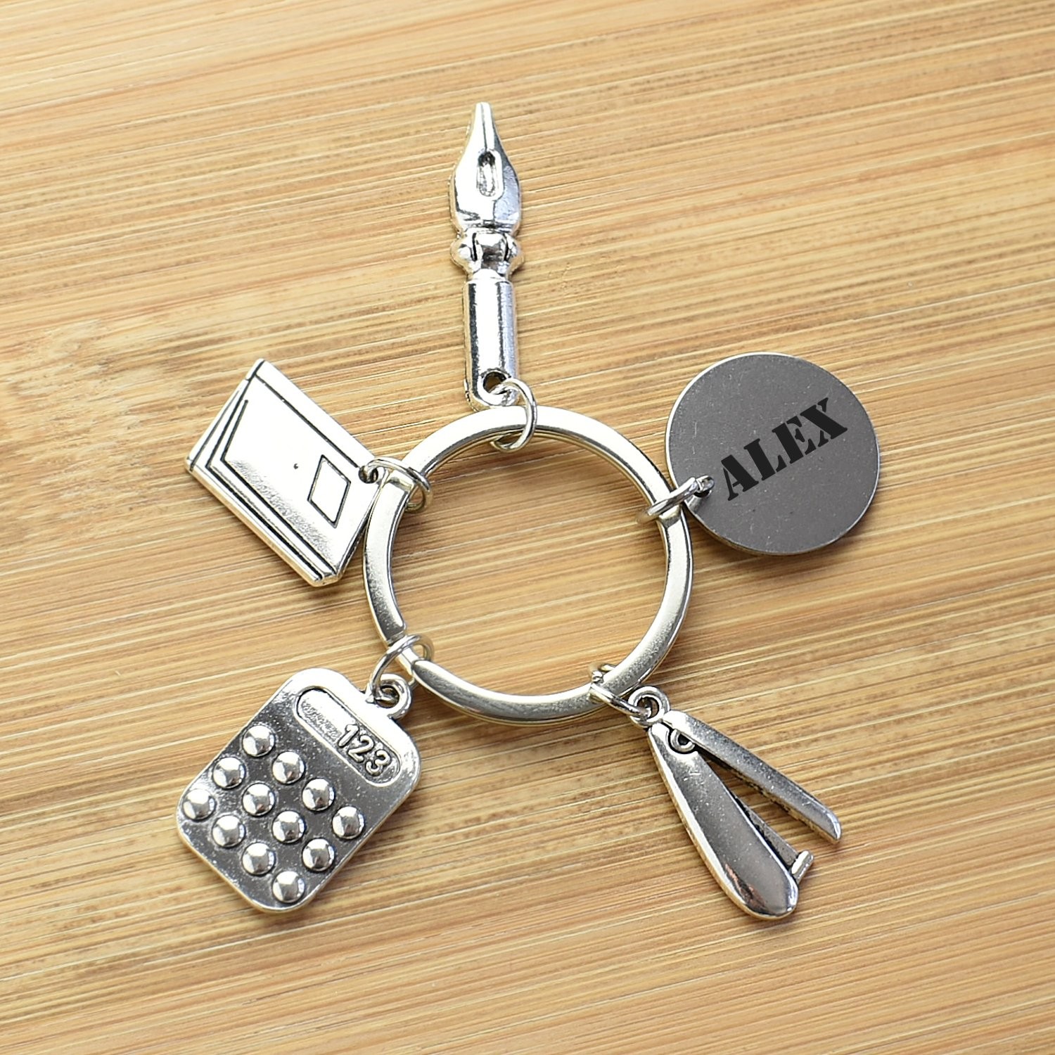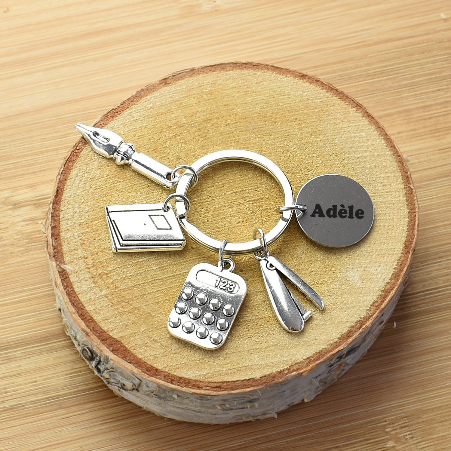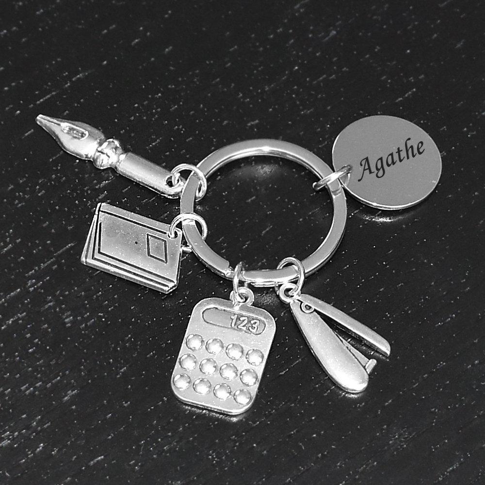 Le porte-clés se compose de quatre breloques distinctes en alliage de zinc argenté vieilli — une plume stylo à pointe finement détaillée, une enveloppe ou chemise cartonnée avec fenêtre gravée, une calculatrice avec touches en relief et afficheur "123", et un coupe-papier ou pince à dessin élancée — chacune accrochée séparément sur l'anneau principal avec la médaille gravable. La finition mate et texturée des quatre breloques renforce le caractère artisanal et soigné de l'ensemble. Le métal résiste bien aux frottements et à l'usure du quotidien sans ternir.