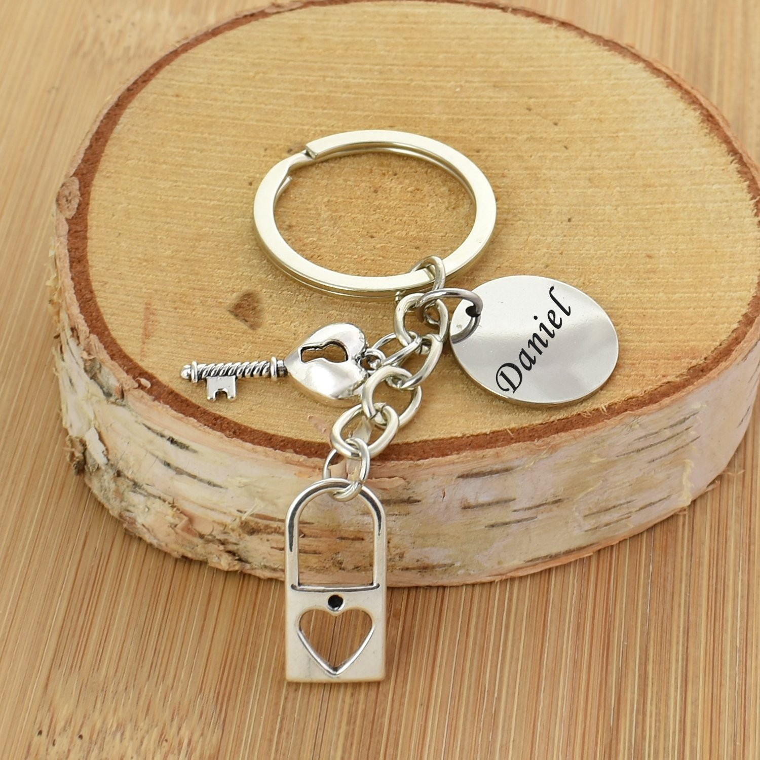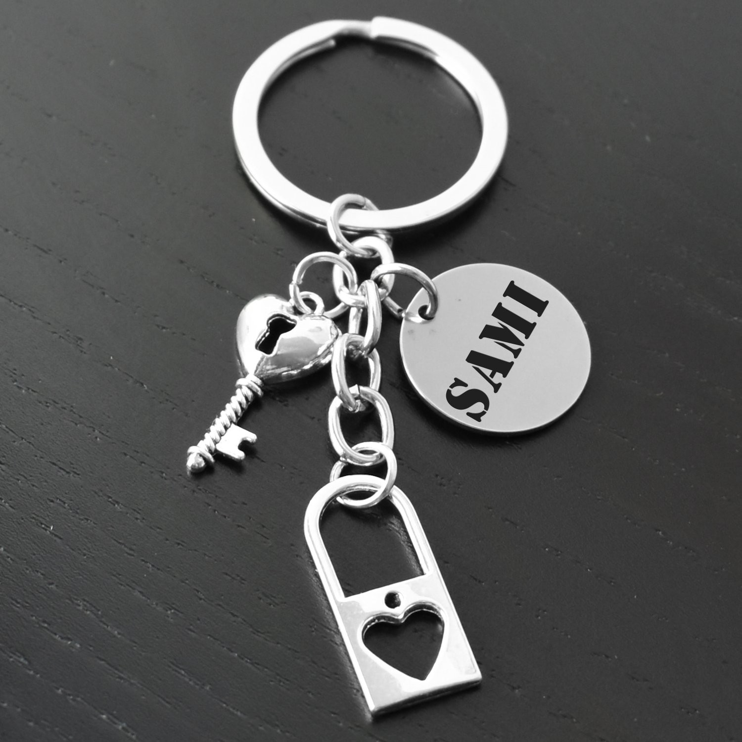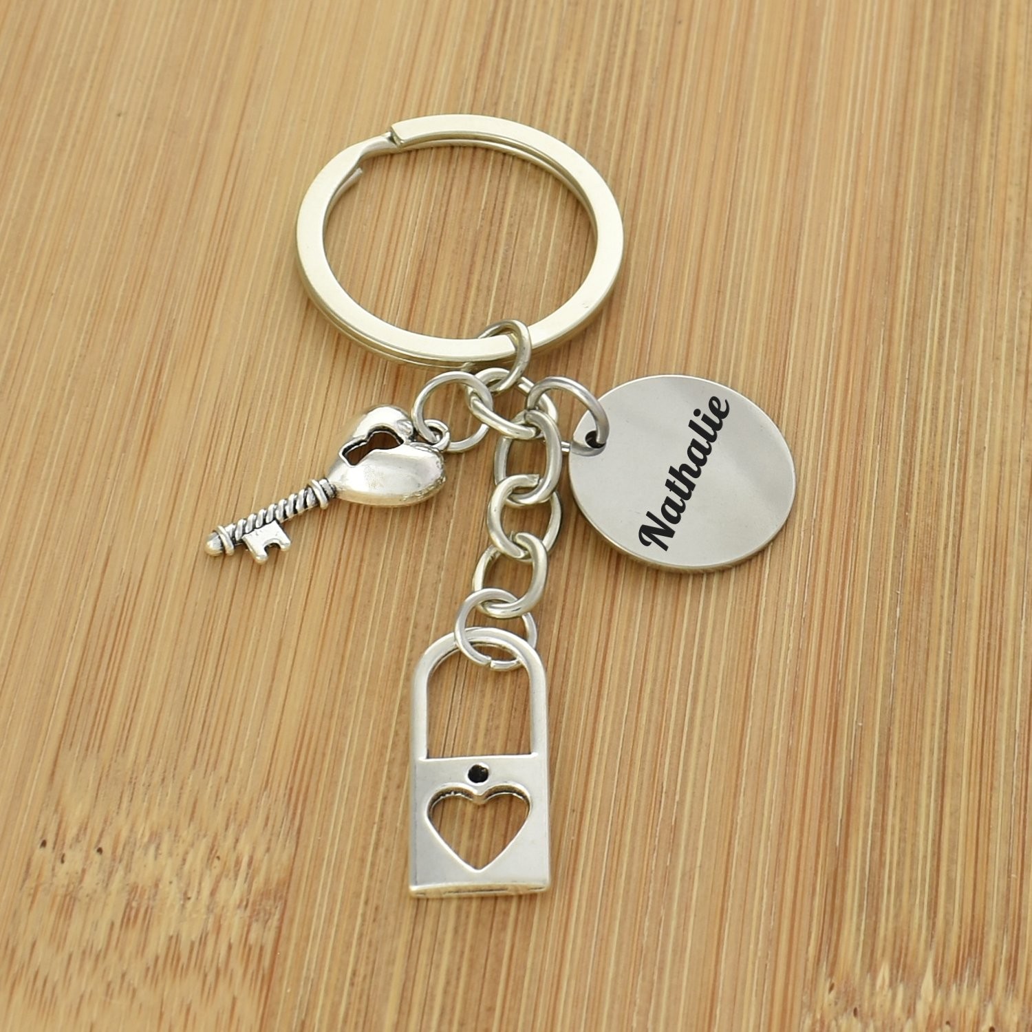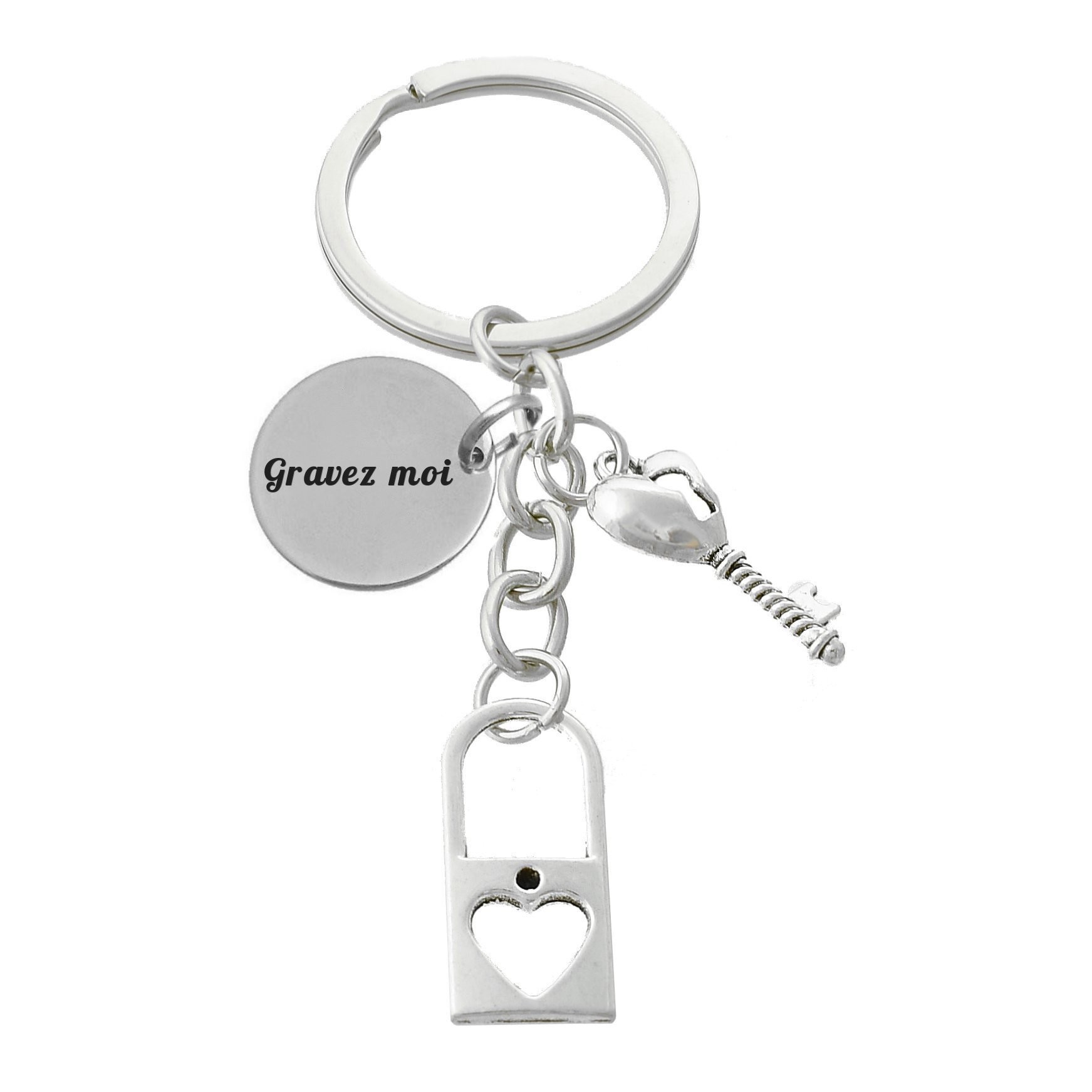 Le porte-clés réunit trois breloques accrochées au même anneau : un cadenas ajouré avec un cœur découpé dans sa panse — sobre et élégant — une clé ancienne dont la tête est un petit cœur plein, et le médaillon gravable rond. L'ensemble est en métal argenté poli, léger et résistant à l'usure et à l'humidité du quotidien. Les trois éléments sont bien proportionnés entre eux et donnent à l'ensemble un aspect soigné sans être surchargé.