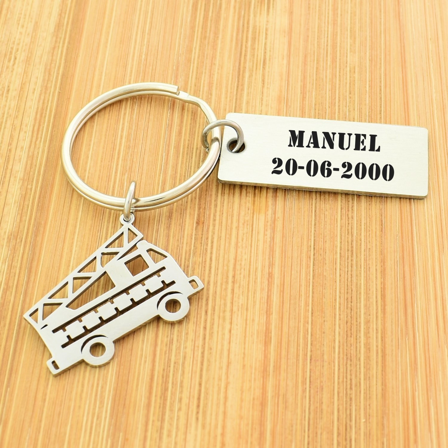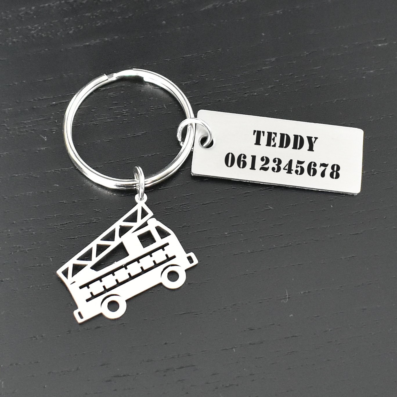 Le pendentif est un camion grande échelle ajouré style origami — carrosserie, échelle déployée, roues et détails de structure découpés dans de l'acier inoxydable poli avec une précision remarquable qui lui donne à la fois légèreté et lisibilité. La silhouette du camion est immédiatement reconnaissable. La plaque gravable rectangulaire est reliée directement à l'anneau de trousseau, avec le camion suspendu en dessous par une petite chaîne. L'acier inox résiste à l'humidité, aux rayures et à l'usage quotidien sans se ternir.