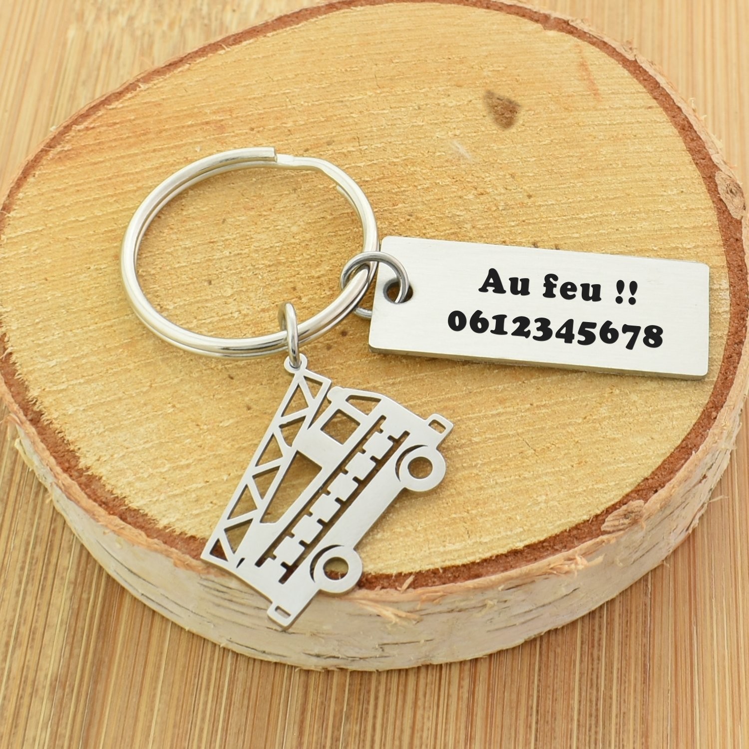 Porte-clés Pompier gravé — Camion Échelle Plaque 2 Lignes Cadeau Personnalisé Acier