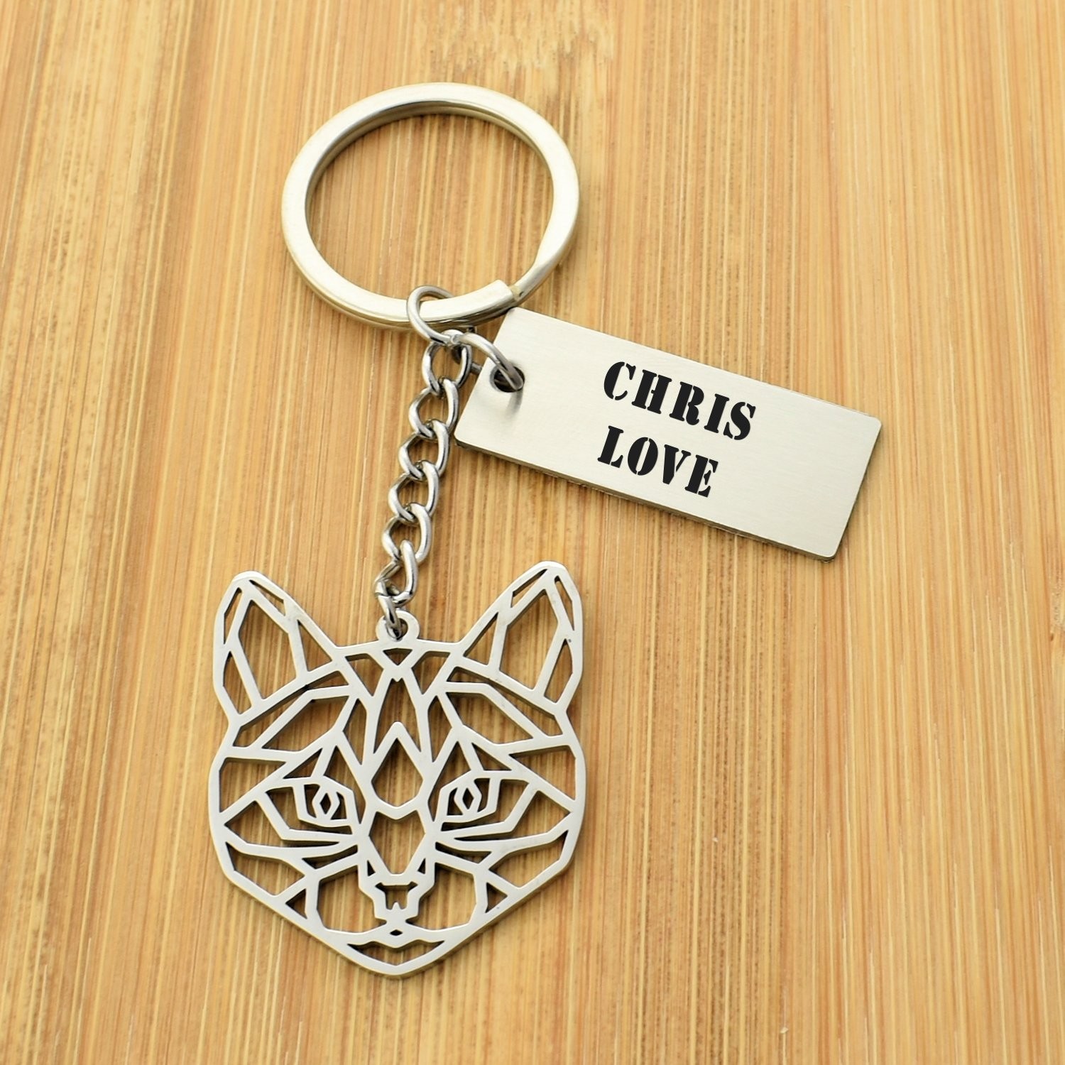 Porte-clés Chat Origami gravé — Plaque 2 Lignes Cadeau Amoureux Chats Personnalisé Acier