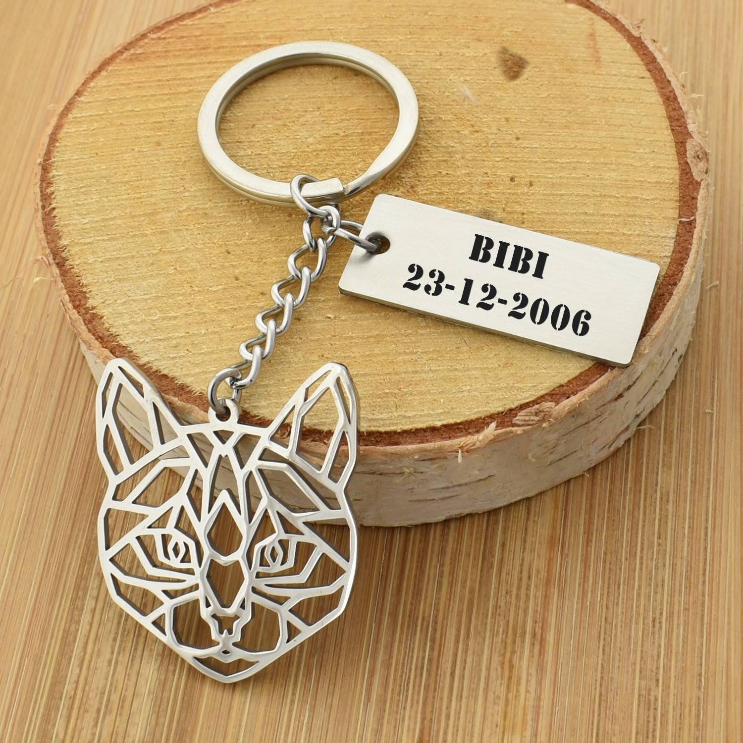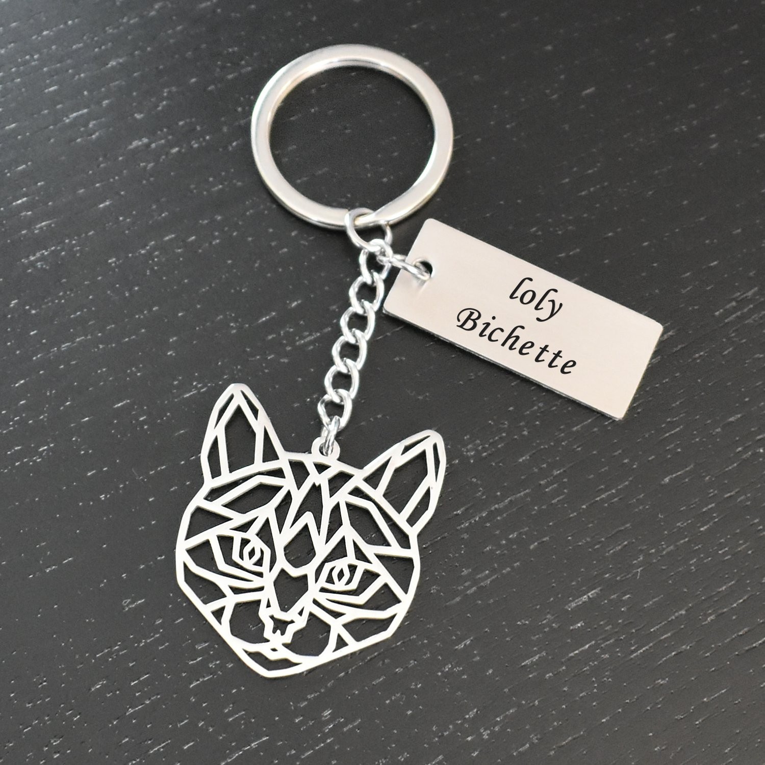 Le pendentif est une tête de chat style origami entièrement ajourée — oreilles pointues, yeux en amande, museau et moustaches suggérés par les découpes géométriques — découpée dans de l'acier inoxydable poli avec une précision qui donne à la pièce une légèreté et une élégance modernes. Le motif est immédiatement reconnaissable pour tout amoureux des félins. La plaque gravable rectangulaire est reliée directement à l'anneau de trousseau, avec la tête de chat suspendue en dessous par une petite chaîne. L'acier inox résiste à l'humidité, aux rayures et à l'usage quotidien sans se ternir.