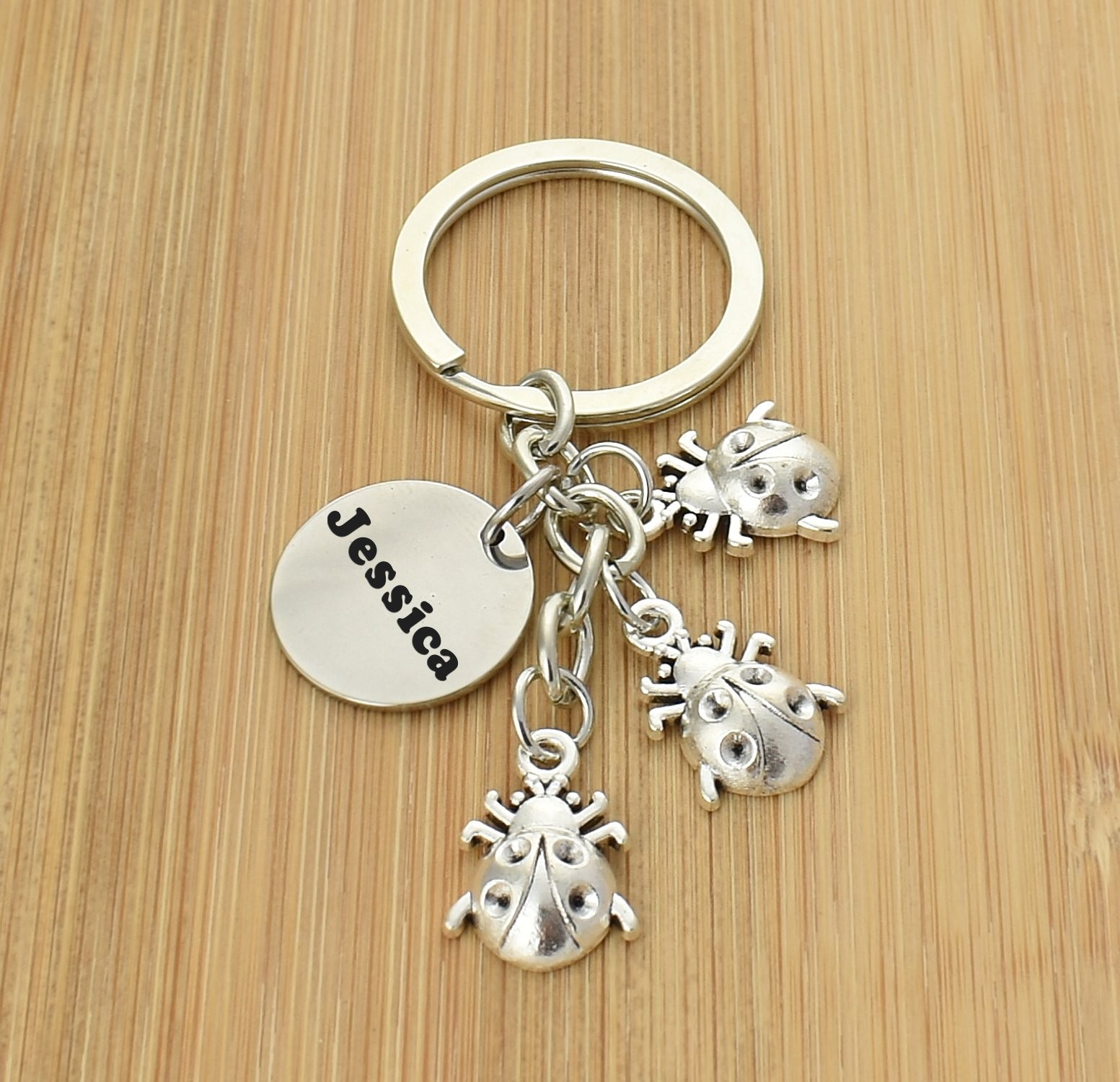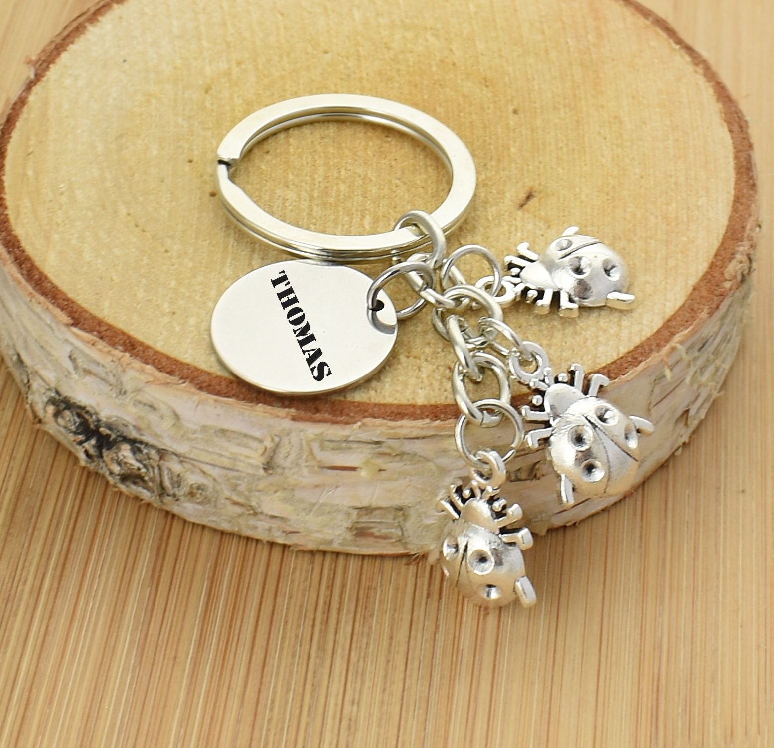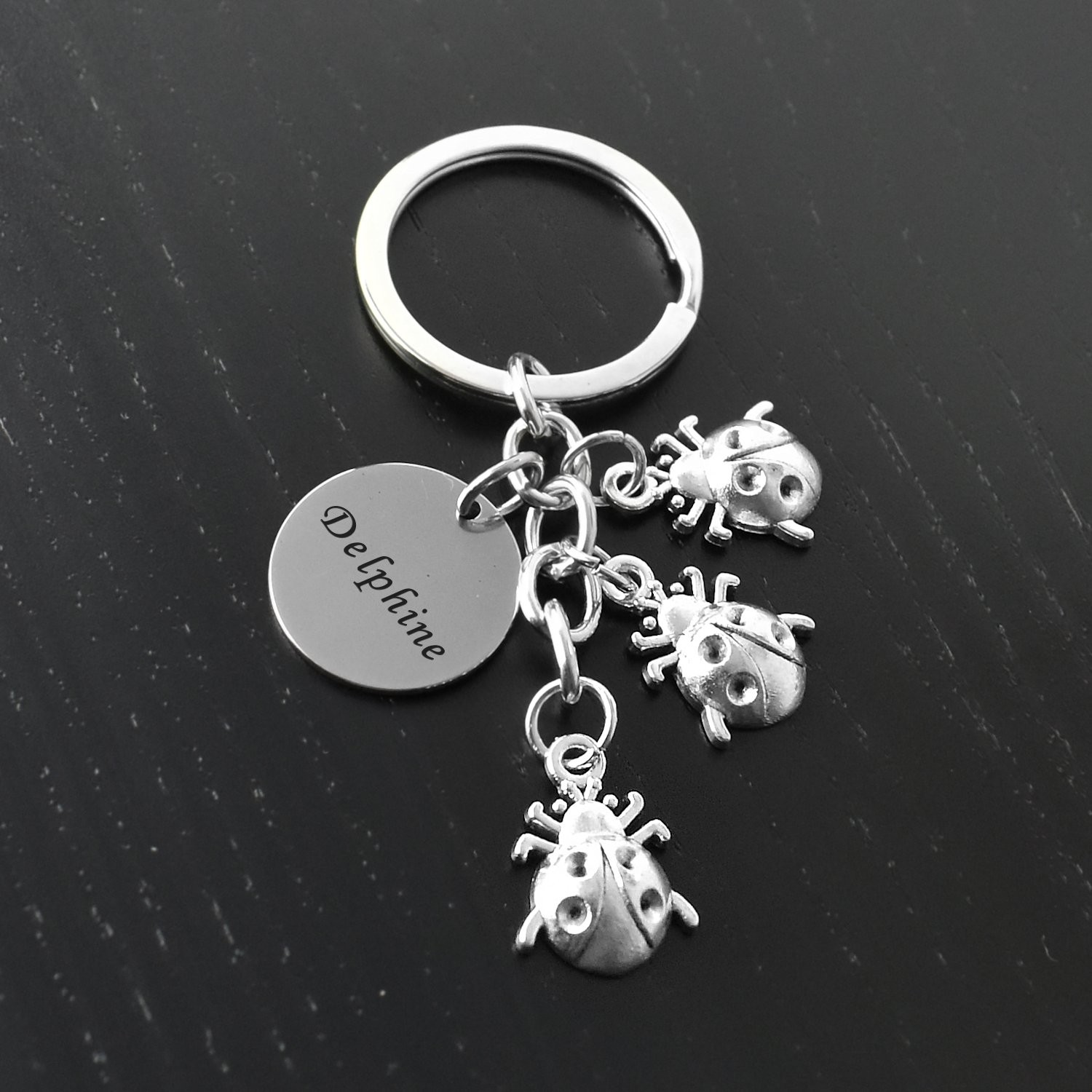 Le porte-clés comprend trois coccinelles en métal argenté vieilli, chacune avec un relief bombé et des détails ciselés sur les élytres et les pattes — accrochées en cascade à l'anneau de trousseau, elles donnent à l'ensemble un effet vivant et généreux. Le médaillon gravable est positionné sur le côté, bien visible. Le métal résiste à l'usure et aux frottements du quotidien sans perdre son aspect.