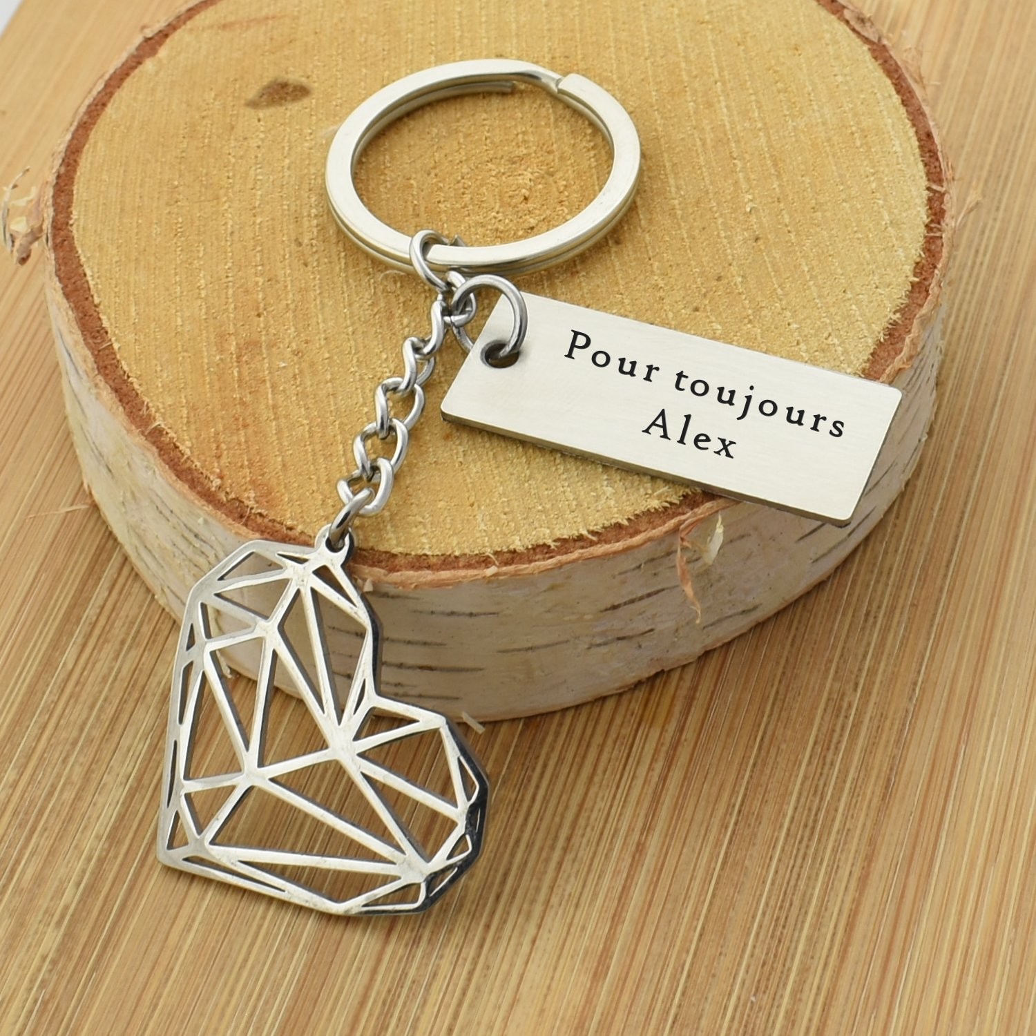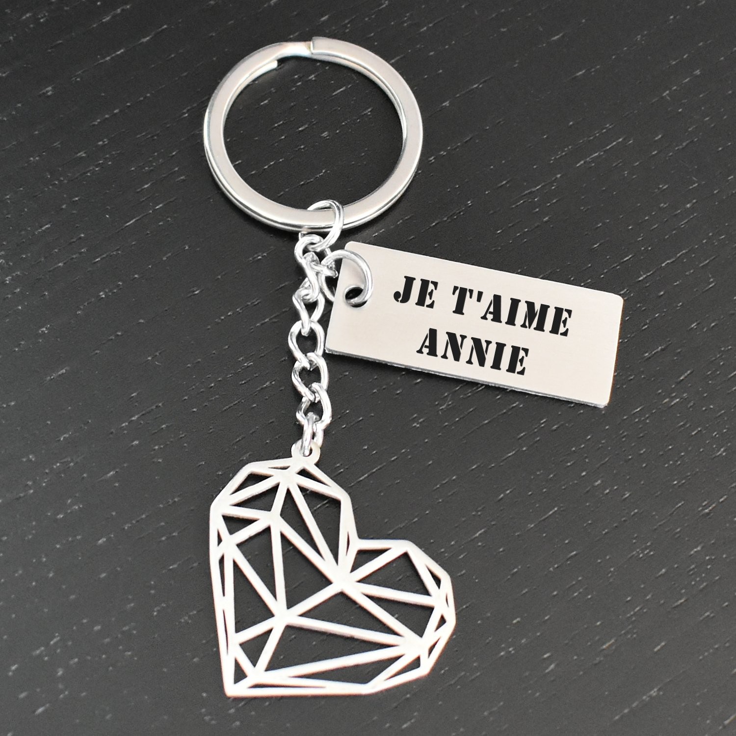 Le pendentif est un grand cœur géométrique ajouré, découpé dans de l'acier poli argenté selon un motif de facettes qui lui donne une profondeur et une légèreté inattendues — pas un cœur classique, une pièce graphique qui attire le regard. Il est relié par une petite chaîne à l'anneau de trousseau, avec la plaque gravable positionnée directement sur l'anneau. L'acier inox résiste à l'humidité, aux frottements et à l'usage quotidien sans se ternir.