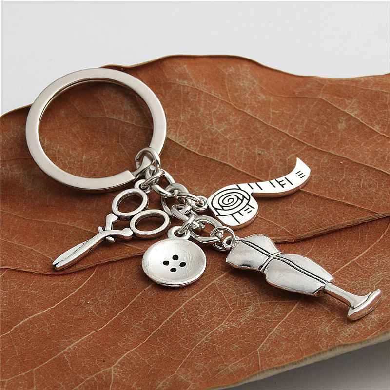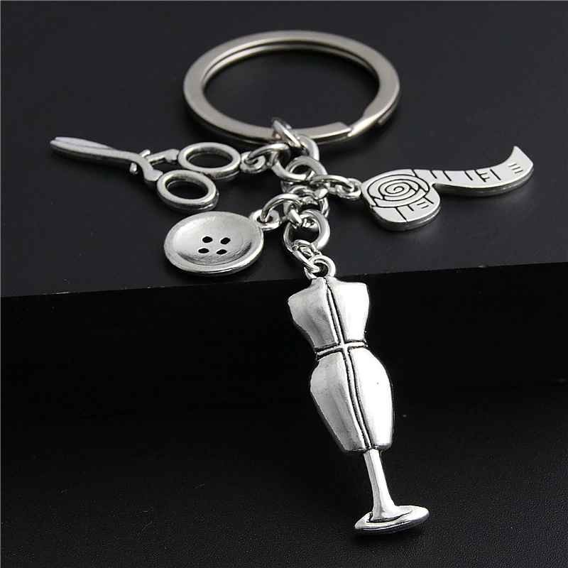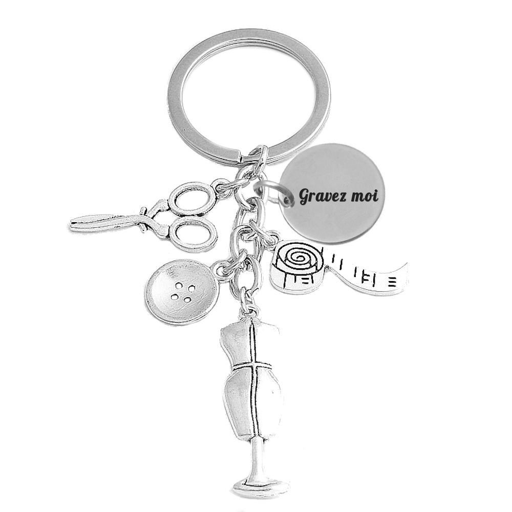 Le porte-clés se compose de quatre breloques distinctes en alliage de zinc argenté vieilli — des ciseaux de couture à lames longues et anneaux bien proportionnés, un bouton à quatre trous avec contour et relief bien dessinés, un mannequin de couture sur pied avec buste ajusté et tige centrale, et un mètre ruban enroulé avec graduations gravées et ruban déroulé visible — chacune accrochée séparément sur l'anneau principal avec la médaille gravable. La réunion de ces quatre outils du quotidien de toute couturière forme un ensemble immédiatement parlant pour tous ceux qui vivent pour la création textile. La finition mate et texturée accentue chaque détail en relief. Le métal résiste bien aux frottements et à l'usure du quotidien sans ternir.