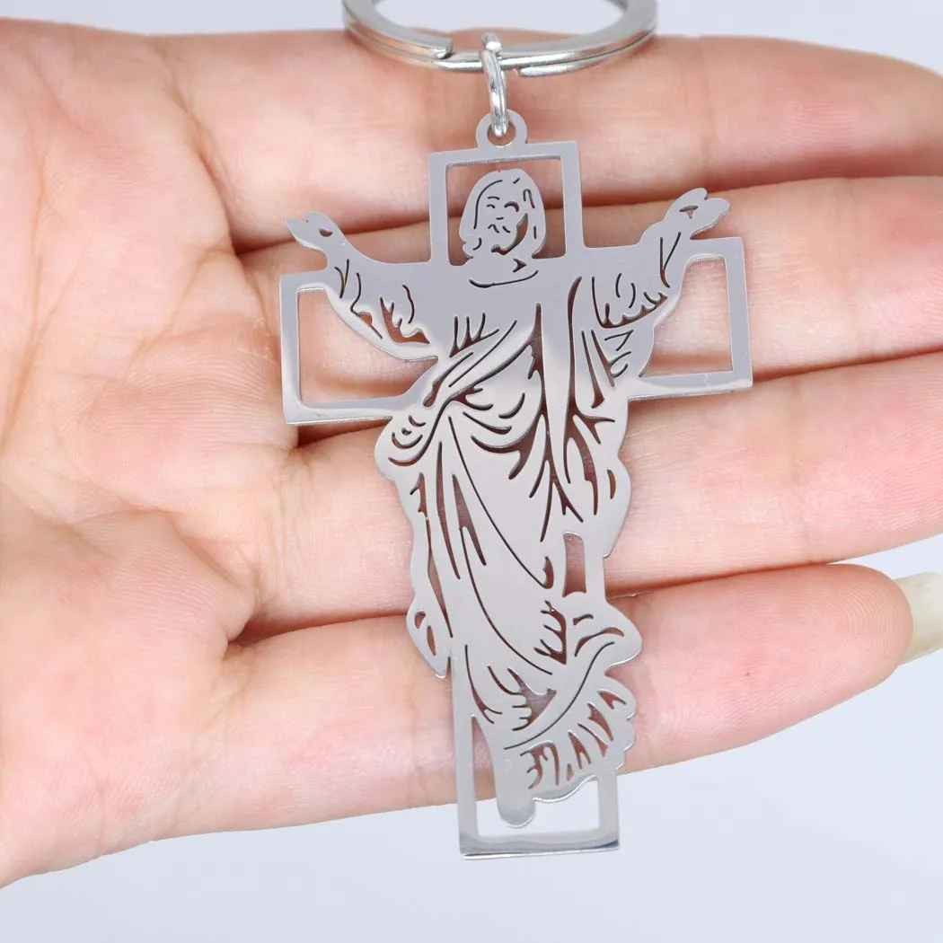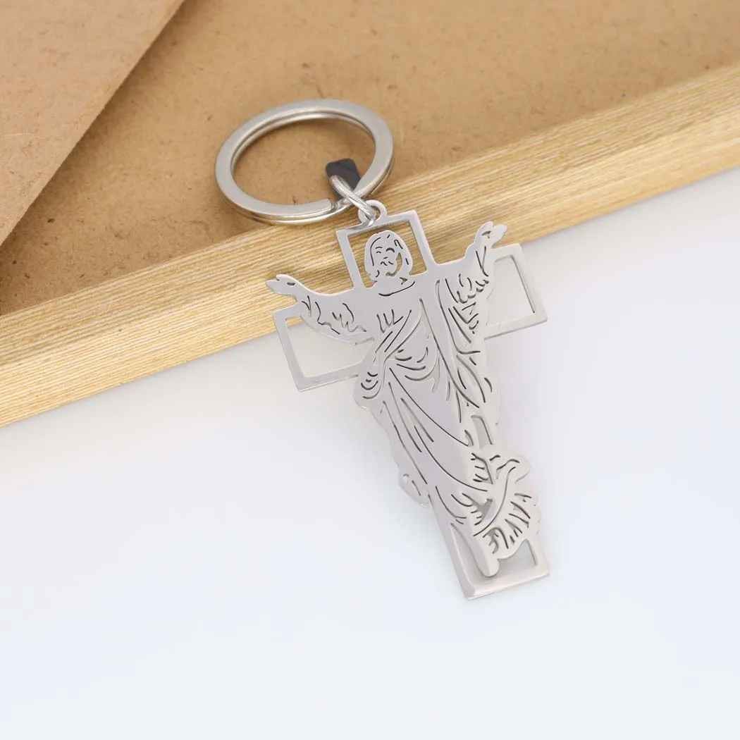 Porte-clés Croix Jésus gravé — Cadeau Spirituel Protection Personnalisé en Acier