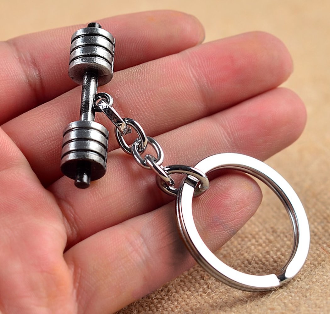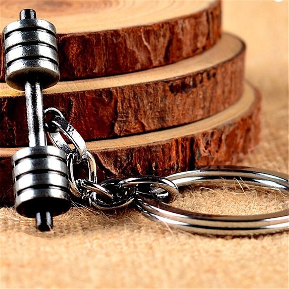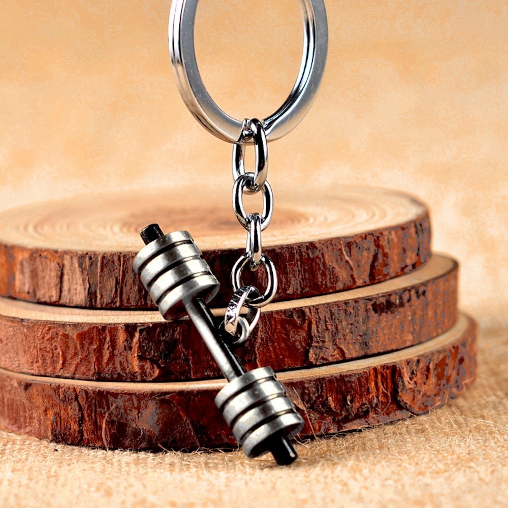 Le pendentif principal est un haltère en métal à la finition gris anthracite vieilli, avec disques et barre bien détaillés. Il est accompagné d'une médaille ronde en acier inoxydable, polie et brossée, accrochée sur un anneau argenté solide avec chaîne à maillons. L'ensemble est robuste, conçu pour résister à l'usure du quotidien — dans une poche, un sac de sport ou sur un trousseau.