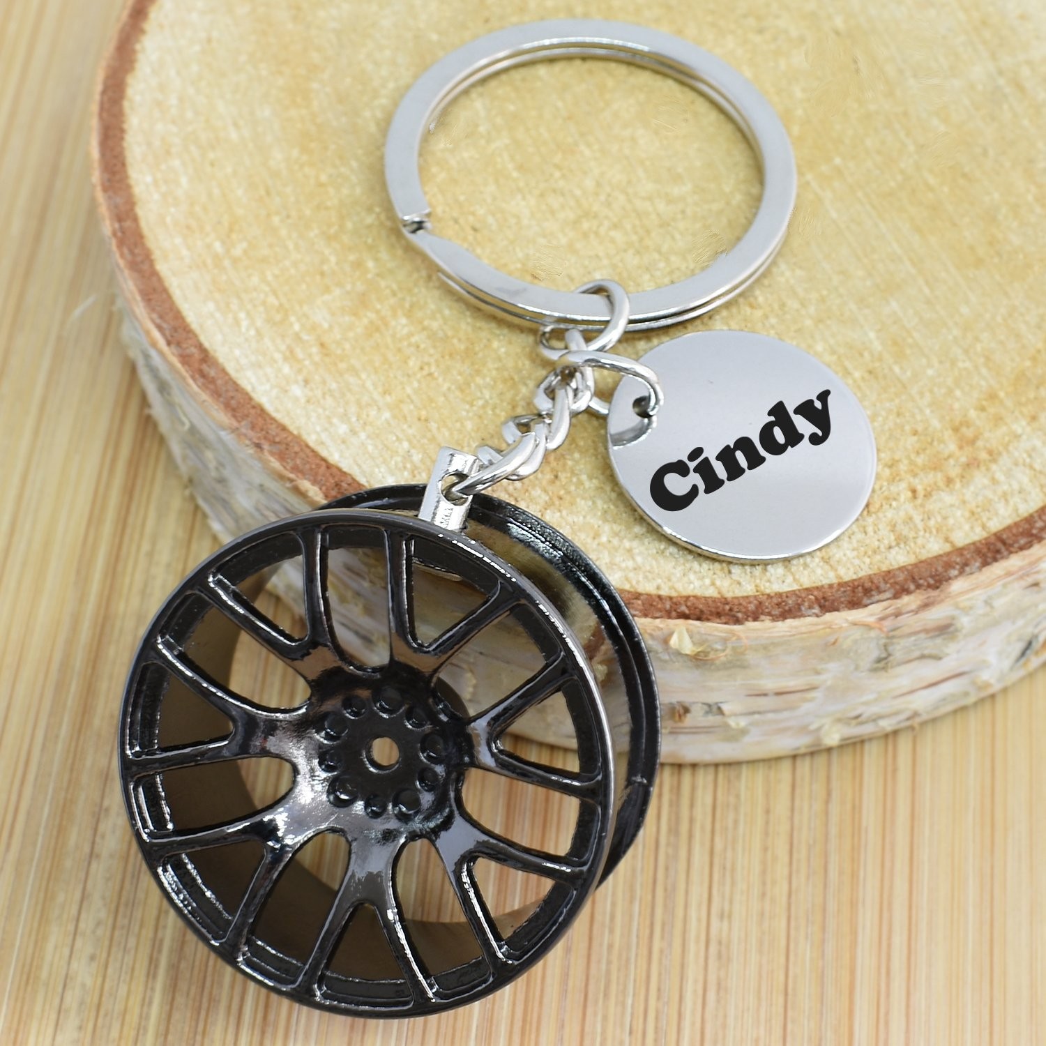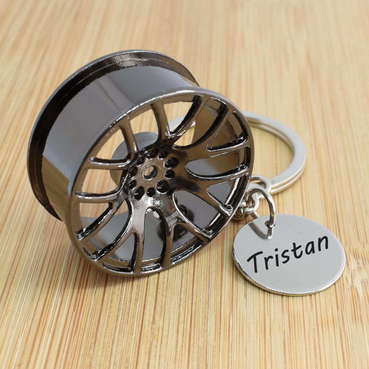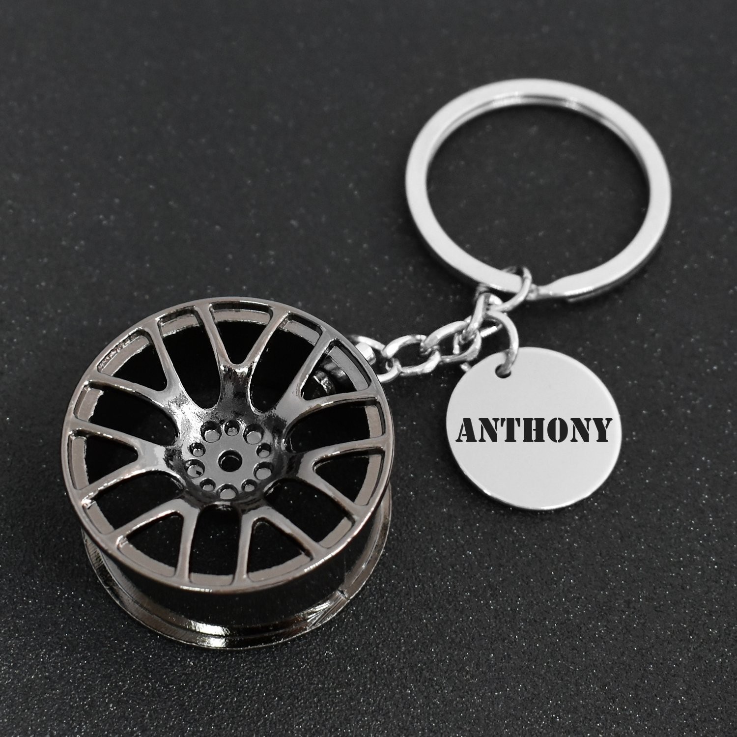 Porte-clés Jante Tuning 3D gravé — Cadeau Voiture Personnalisé Métal Noir