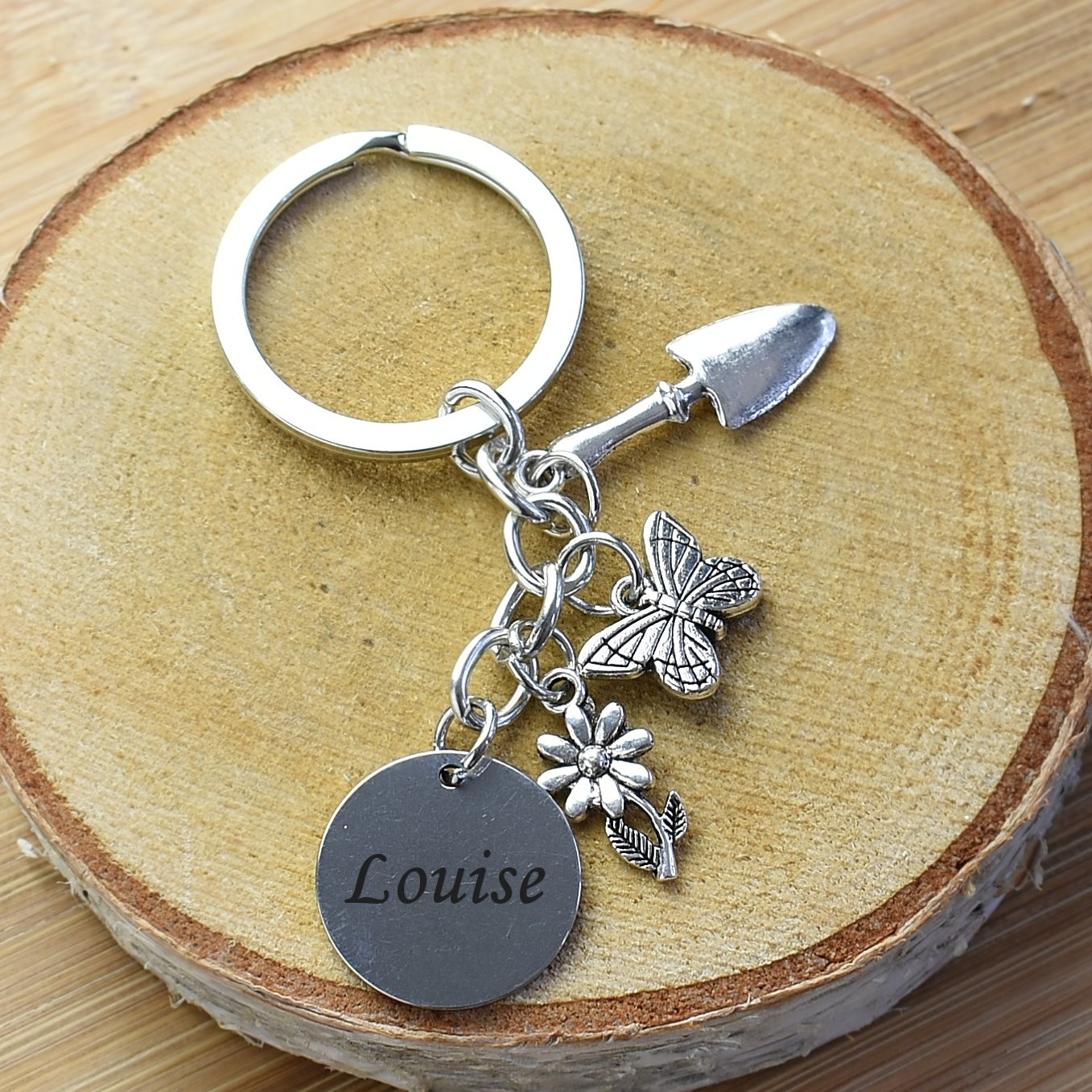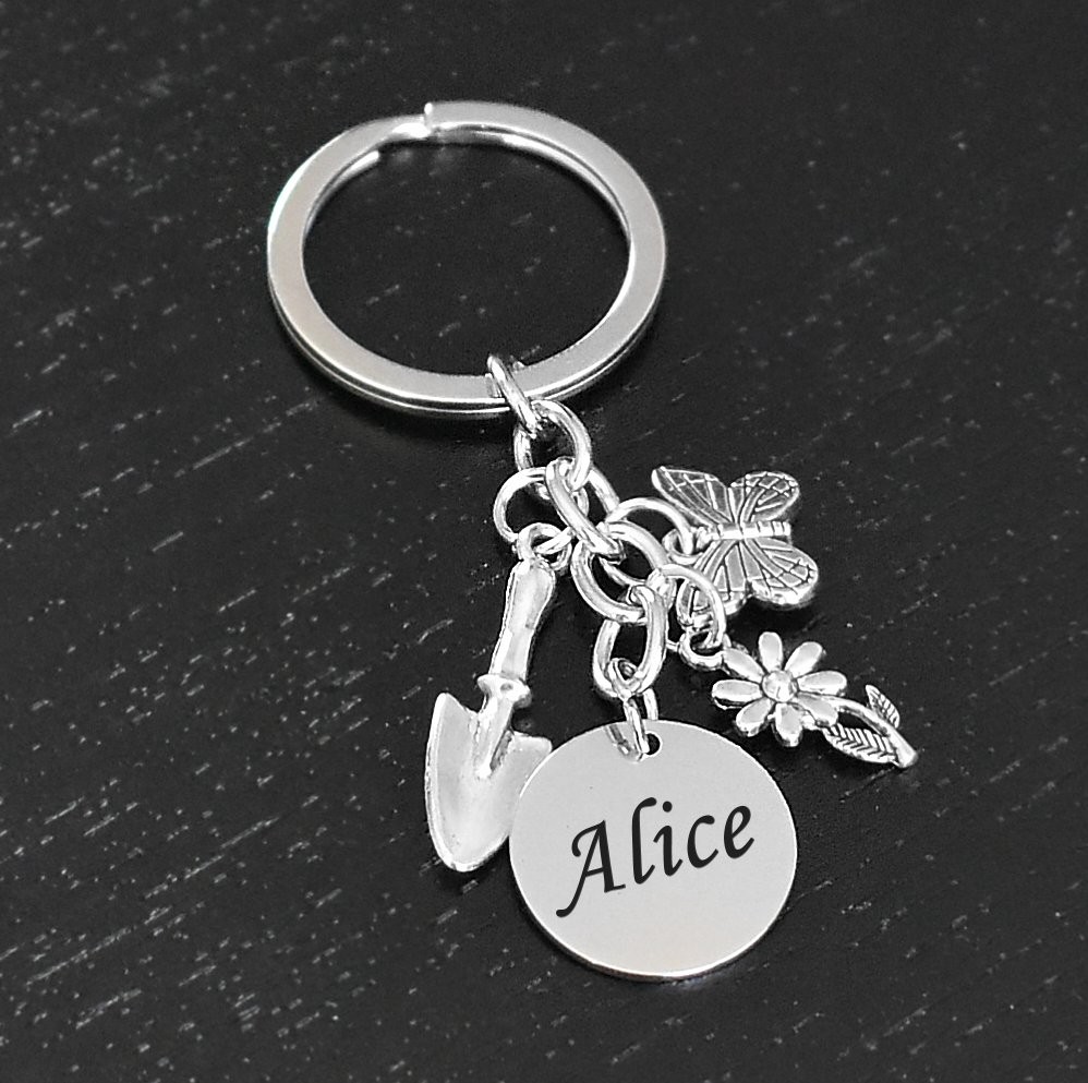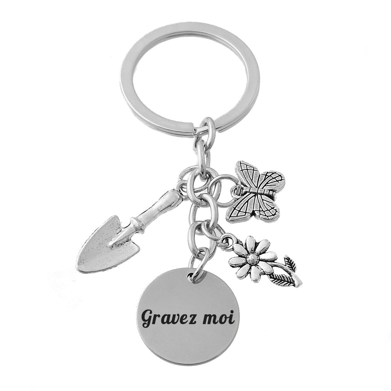 Le porte-clés se compose de trois breloques distinctes en alliage de zinc argenté vieilli — une truelle de jardinage avec manche strié et lame pointue bien proportionnée, un papillon aux ailes nervurées finement détaillées ailes déployées, et une marguerite à pétales évasés avec tige et feuille gravées — chacune accrochée séparément sur l'anneau principal avec la médaille gravable suspendue en dessous. La finition mate et texturée des trois breloques accentue chaque détail en relief et donne un rendu artisanal et nature qui colle parfaitement à l'univers du jardin. Le métal résiste bien aux frottements et à l'usure du quotidien sans ternir.