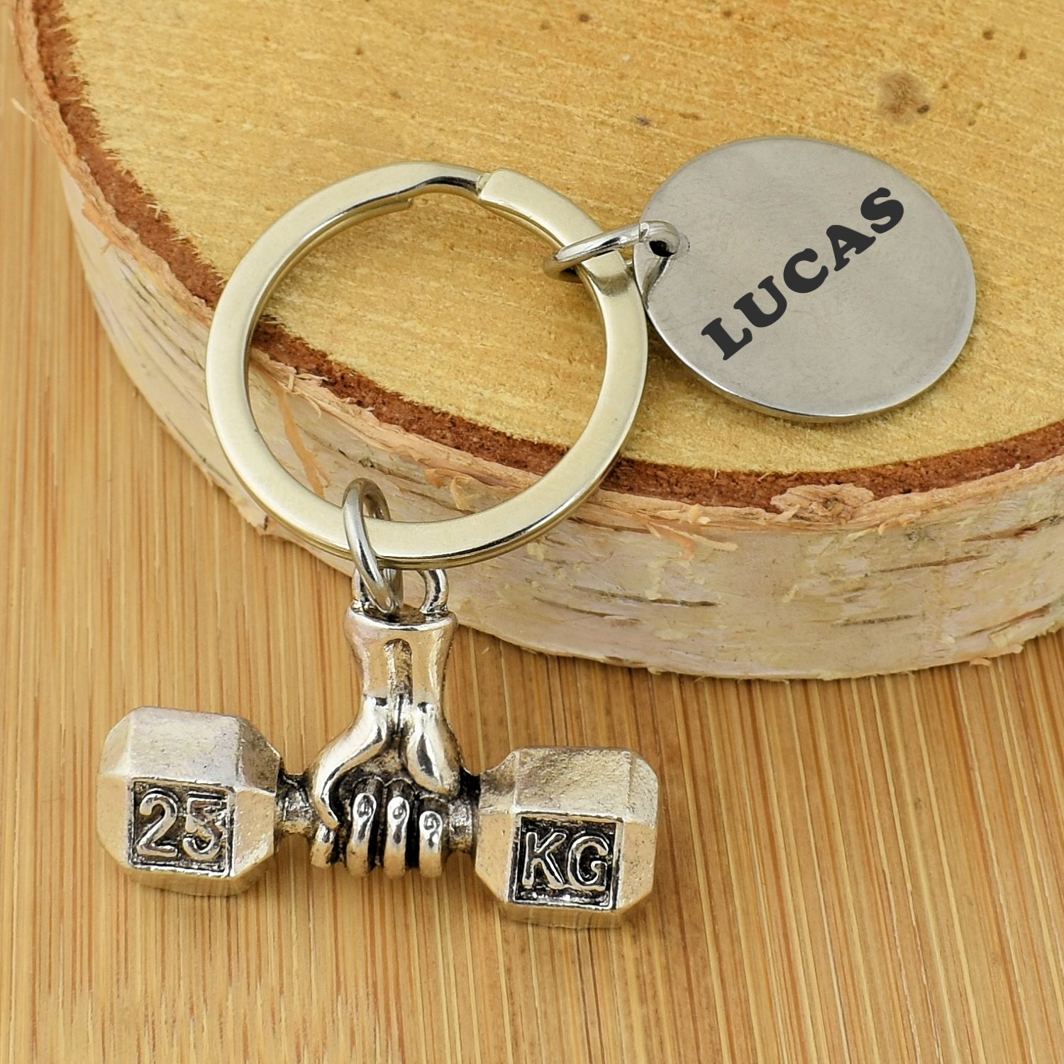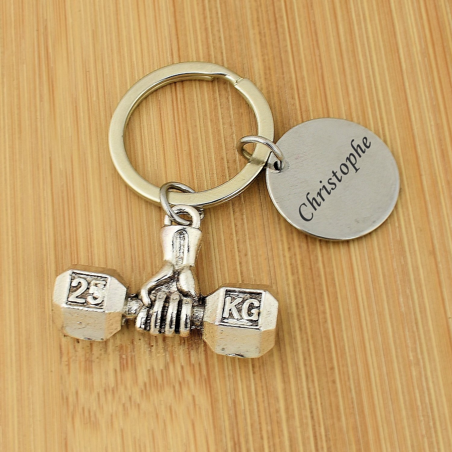 Tu cherches un cadeau pour quelqu’un qui ne rate jamais une séance, qui parle PR, squat et déjeuner protéiné comme d’autres parlent week-end, et dont la salle de sport est son vrai chez-lui ? Ce porte-clés main tenant un haltère 25 kg en métal argenté vieilli est fait pour lui — à personnaliser sur le médaillon avec un prénom, un surnom ou une phrase comme « Plus fort chaque jour ».