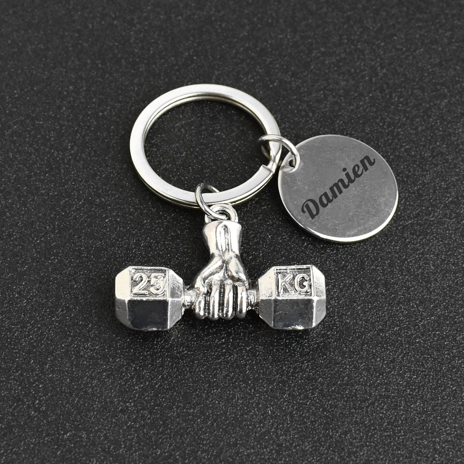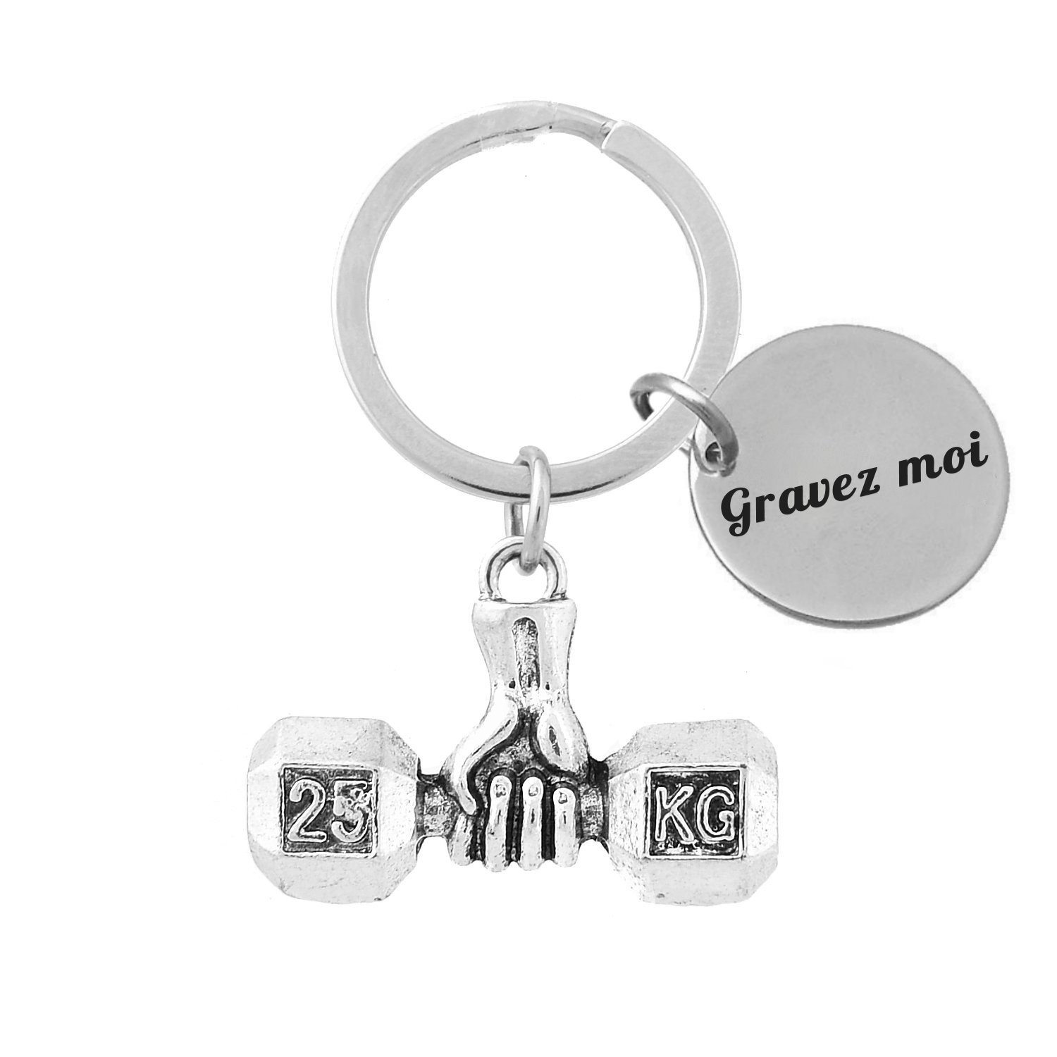 Le pendentif représente une main musclée empoignant fermement un haltère hexagonal gravé "25 KG" de chaque côté — le tout en métal argenté vieilli avec une belle patine sombre dans les creux qui donne du relief et du réalisme à chaque détail, des phalanges de la main aux facettes de l'haltère. La pièce est large, avec un vrai poids visuel au bout du trousseau. Le médaillon gravable est relié directement à l'anneau de trousseau, positionné sur le côté. Résistant à l'humidité et à l'usure du quotidien sans entretien particulier.