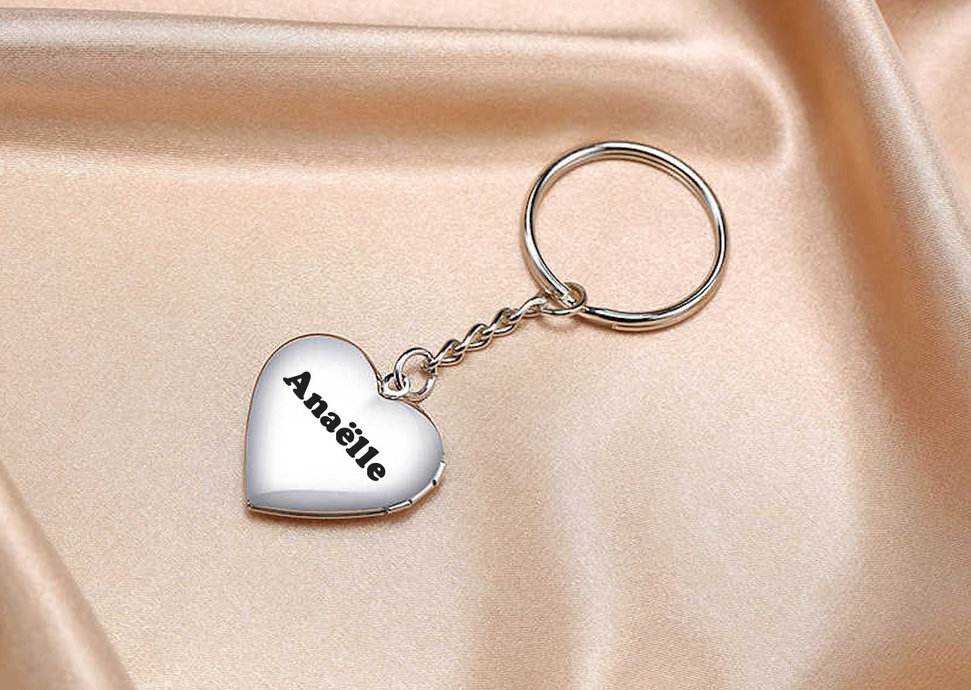 Ce porte-clés a une particularité : il se grave des deux côtés. On peut mettre un prénom recto et une date verso, "Maman" d'un côté et "Je t'aime" de l'autre, ou deux prénoms — un par face. La gravure est réalisée au laser sur chaque côté du médaillon : tracé net, précis, permanent. Et le médaillon s'ouvre pour glisser à l'intérieur une petite photo format vignette — le détail qui fait toute la différence.