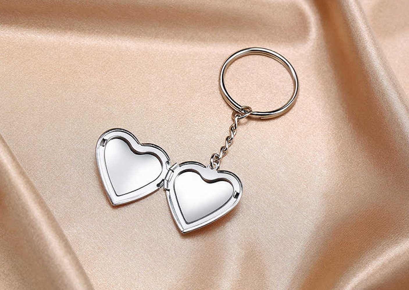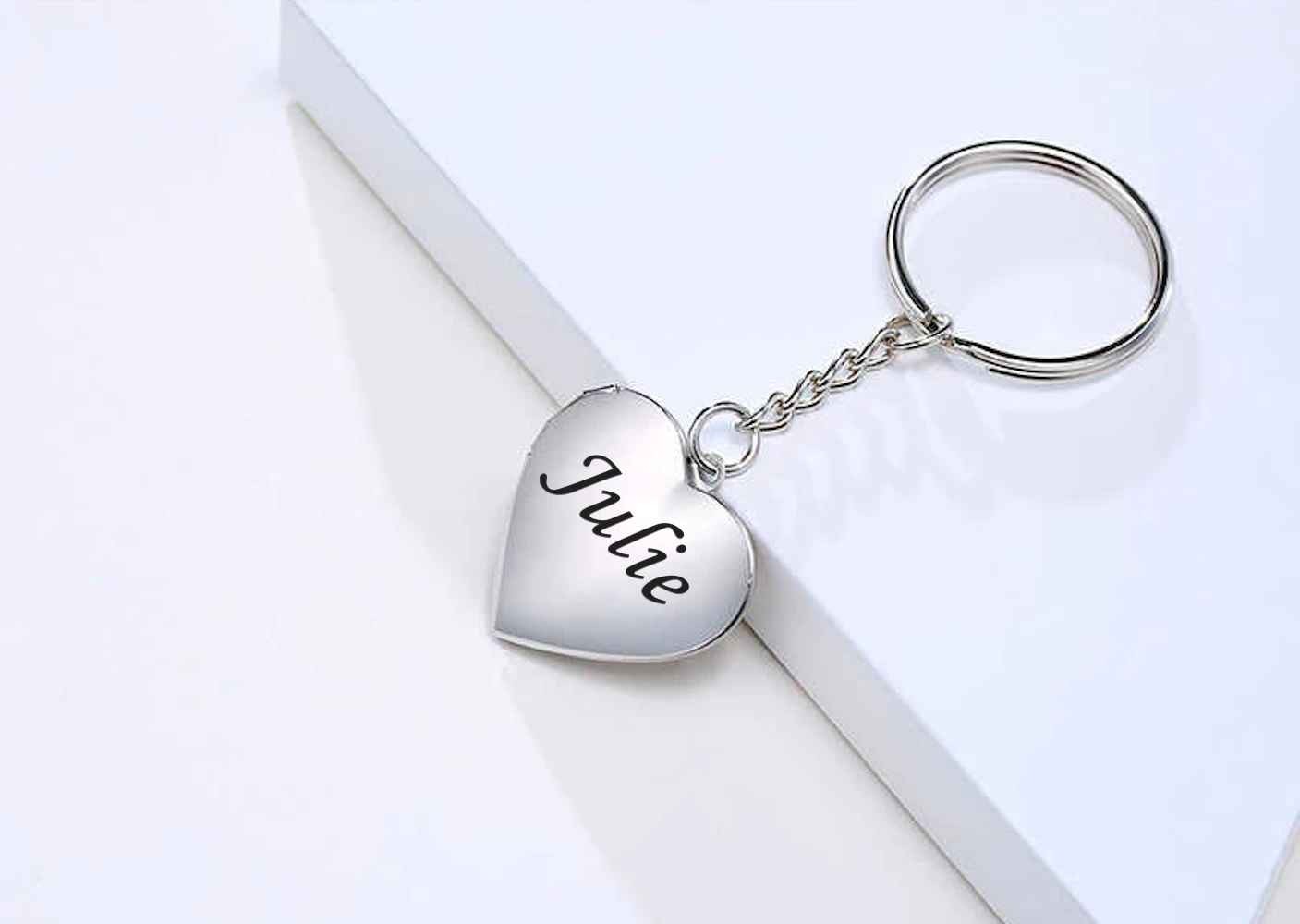 Le pendentif est un médaillon cœur en acier inoxydable poli brillant, avec une charnière sur le côté qui permet de l'ouvrir facilement. La surface lisse et bombée offre une belle surface de gravure des deux côtés. L'ensemble est monté sur un anneau porte-clés standard avec chaîne intermédiaire. L'acier inoxydable résiste à l'humidité, aux rayures légères et à l'usure quotidienne sans ternir ni se déformer.