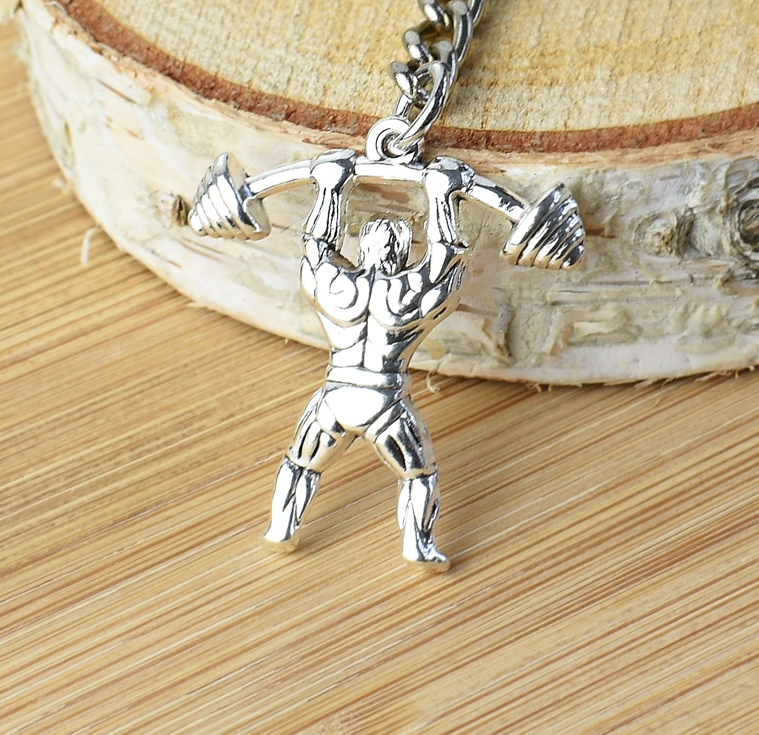 Le pendentif représente un athlète musclé en train de soulever une barre chargée au-dessus de sa tête, avec un niveau de détail impressionnant pour sa taille — musculature, posture, haltères bien dessinés. Il est en alliage de zinc argenté vieilli, à la finition mate et texturée qui renforce le côté brut et sportif. L'ensemble est monté sur un anneau porte-clés standard avec chaîne intermédiaire, solide et résistant à l'usure intensive du quotidien.