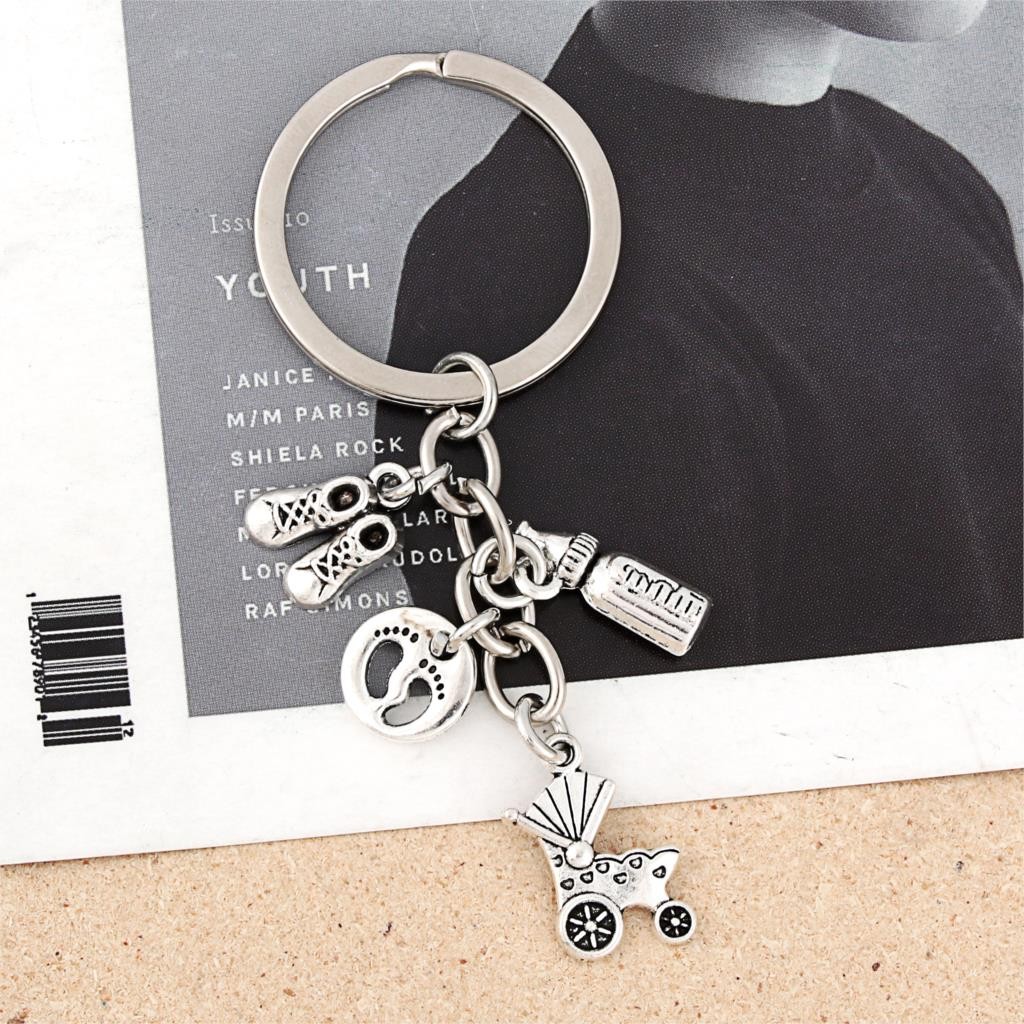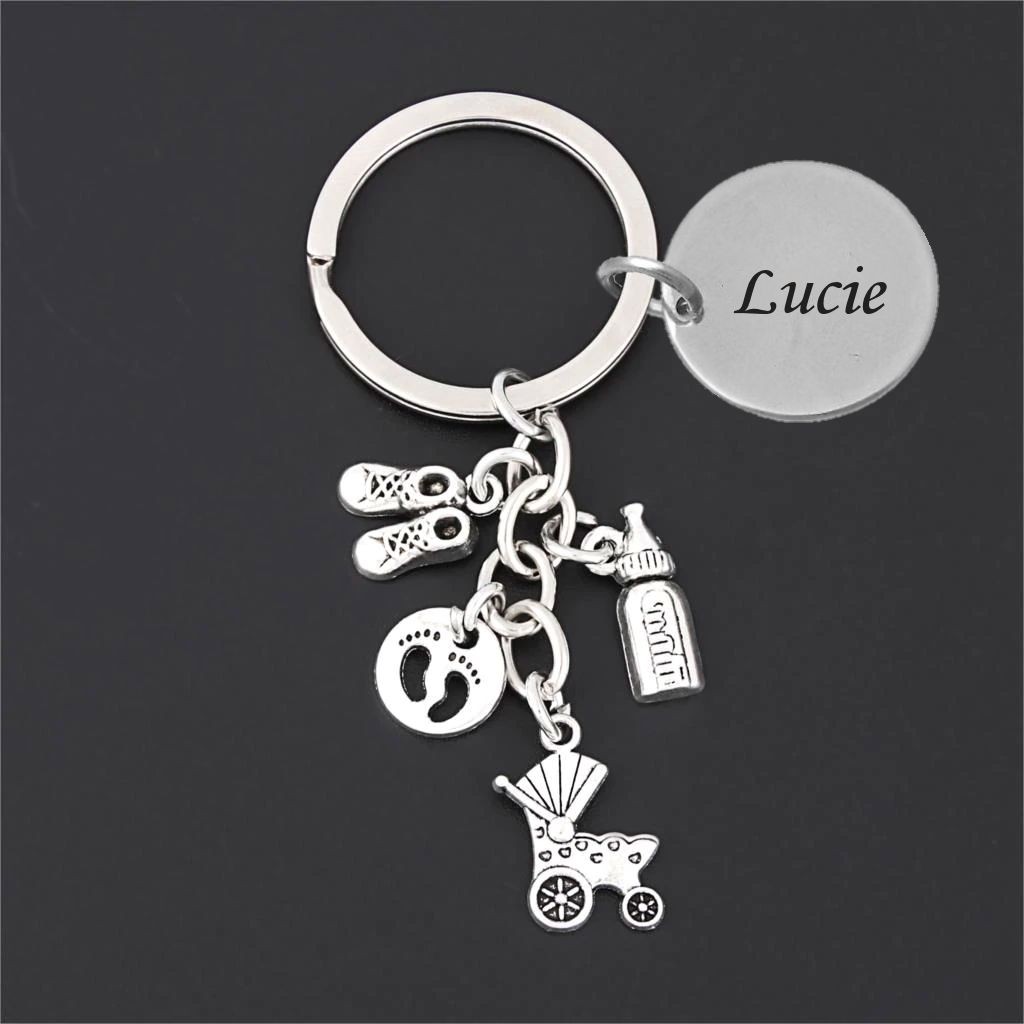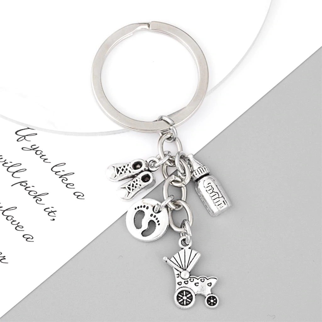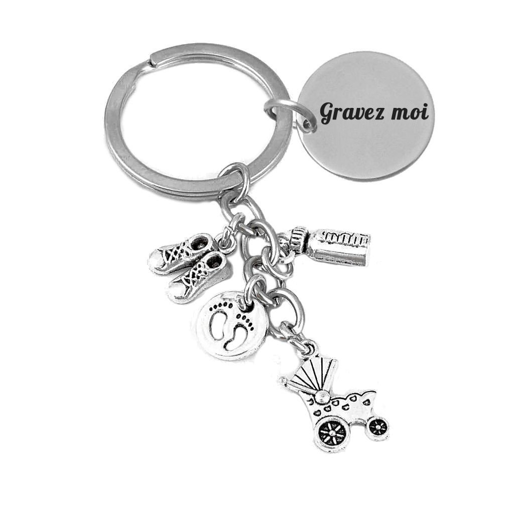 Le porte-clés réunit quatre breloques accrochées au même anneau : un landau ancien style rétro aux roues détaillées, une paire de chaussons de bébé, un biberon miniature, et un médaillon rond avec des empreintes de pieds de bébé — le tout en métal argenté vieilli avec une patine douce et chaleureuse. Le médaillon gravable est positionné directement sur l'anneau de trousseau, bien visible aux côtés des breloques. Solide et résistant à l'usage quotidien.