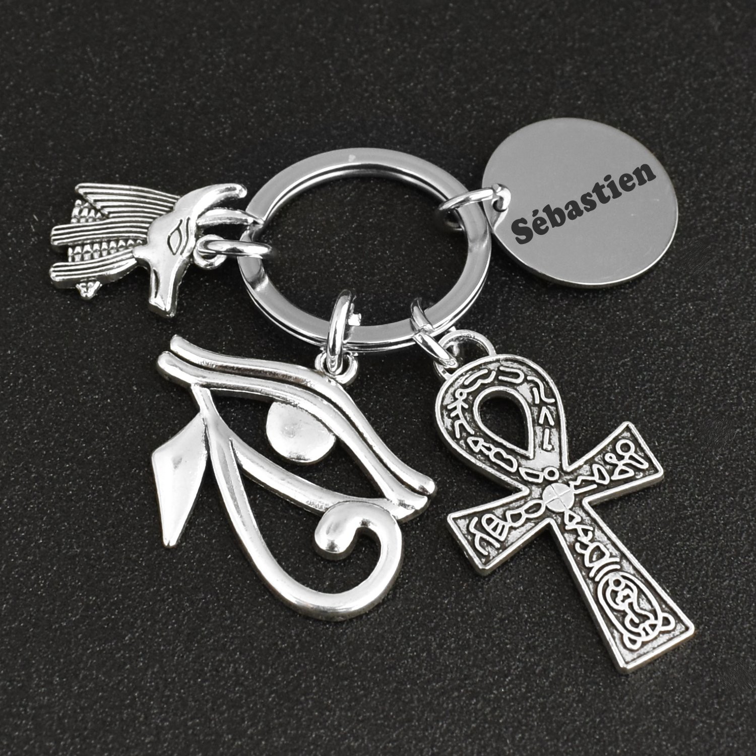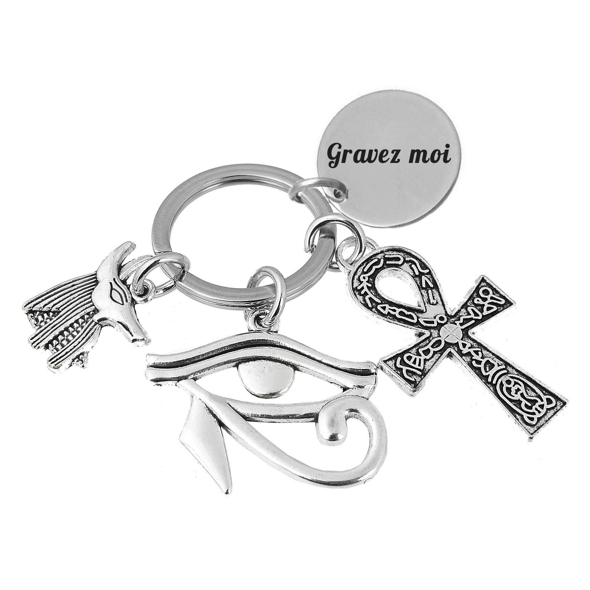 Le porte-clés réunit quatre éléments accrochés au même anneau : un grand Œil d'Horus central aux lignes larges et caractéristiques finement détaillées, une croix Ânkh ornée de motifs entrelacés ciselés avec une grande richesse décorative, une figurine de dieu à tête de chacal — Anubis, gardien des morts et des âmes — aux ailes et vêtements rituels reproduits avec soin, et le médaillon gravable rond. L'ensemble est en métal argenté vieilli avec une patine profonde dans les creux qui renforce le caractère antique et mystique de chaque pièce. Résistant à l'humidité et à l'usure du quotidien.