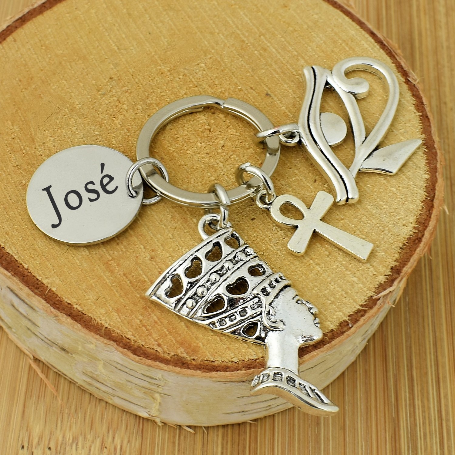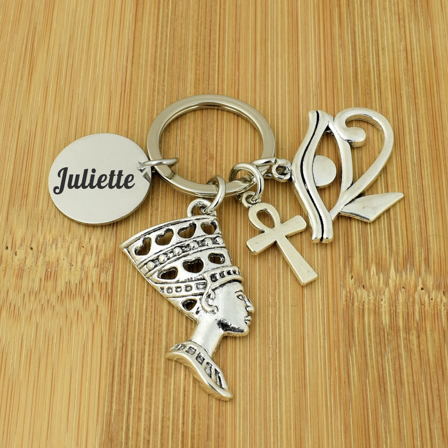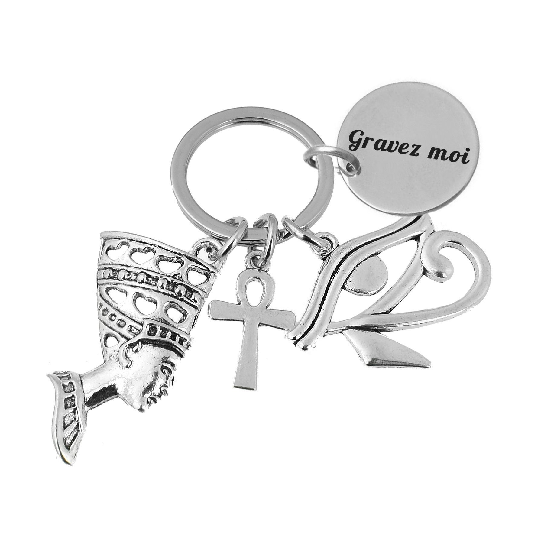 Le porte-clés réunit quatre breloques accrochées au même anneau : un buste de Néfertiti en métal argenté vieilli finement ciselé avec sa coiffe caractéristique, une croix Ânkh symbole de vie éternelle, un Œil d'Horus ajouré aux lignes élégantes, et le médaillon gravable rond. L'ensemble est en métal argenté vieilli avec une patine qui renforce le caractère antique et mystique de l'objet. Solide et résistant à l'usage quotidien.