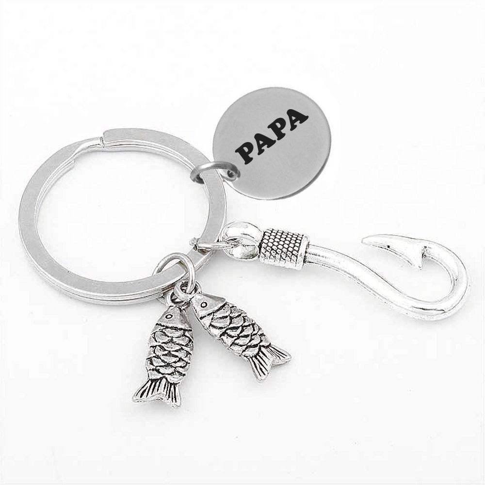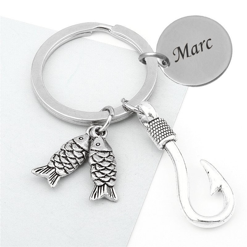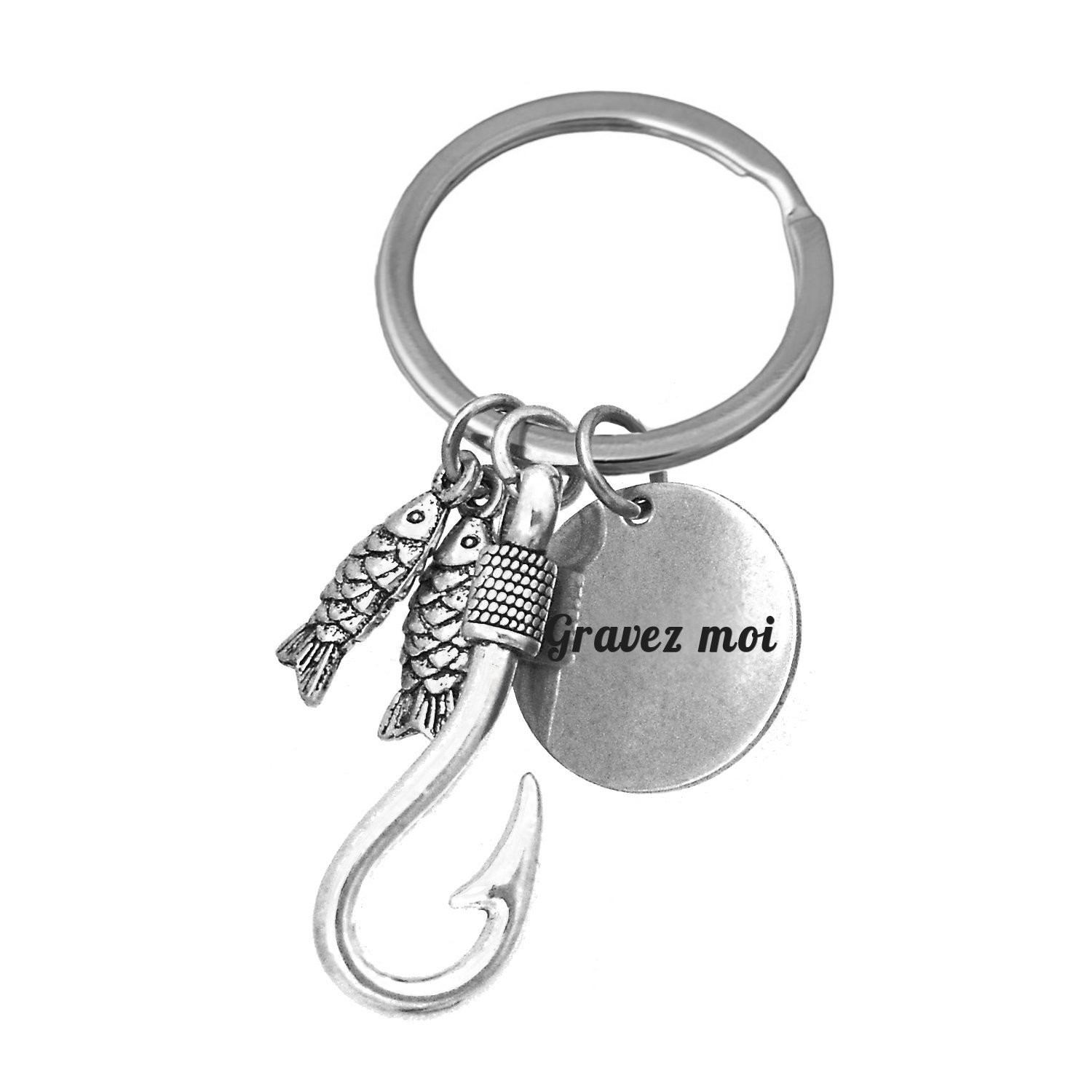 Porte-clés Pêche gravé — Hameçon Poissons Cadeau Pêcheur Personnalisé Métal Argenté