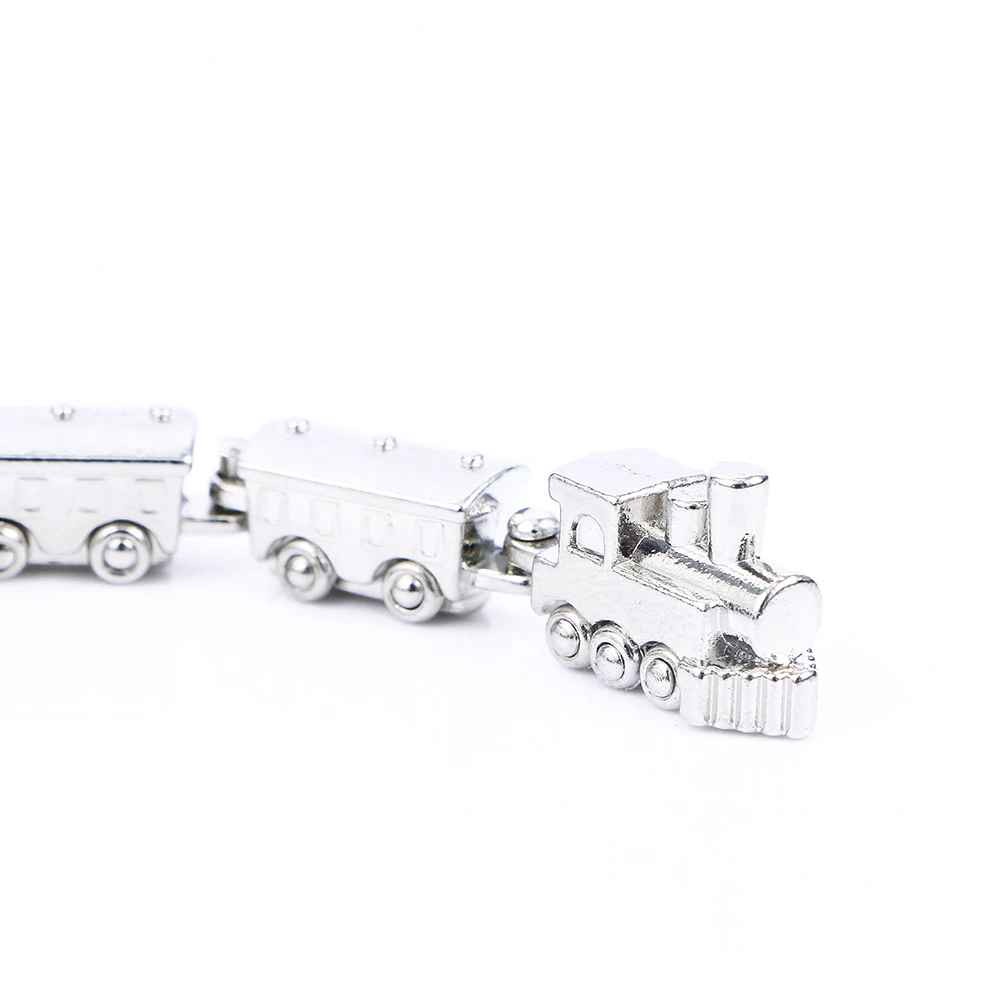 Le pendentif représente un train complet en miniature — une locomotive à vapeur avec cheminée suivie de deux wagons voyageurs, le tout articulé et accroché en ligne sur l'anneau principal. Chaque élément est en alliage de zinc argenté avec des détails bien sculptés — fenêtres, roues, parois striées — pour un rendu réaliste et soigné. La finition argentée mate et brillante mêlée donne du relief à l'ensemble. Le métal résiste bien aux frottements et à l'usure du quotidien.
