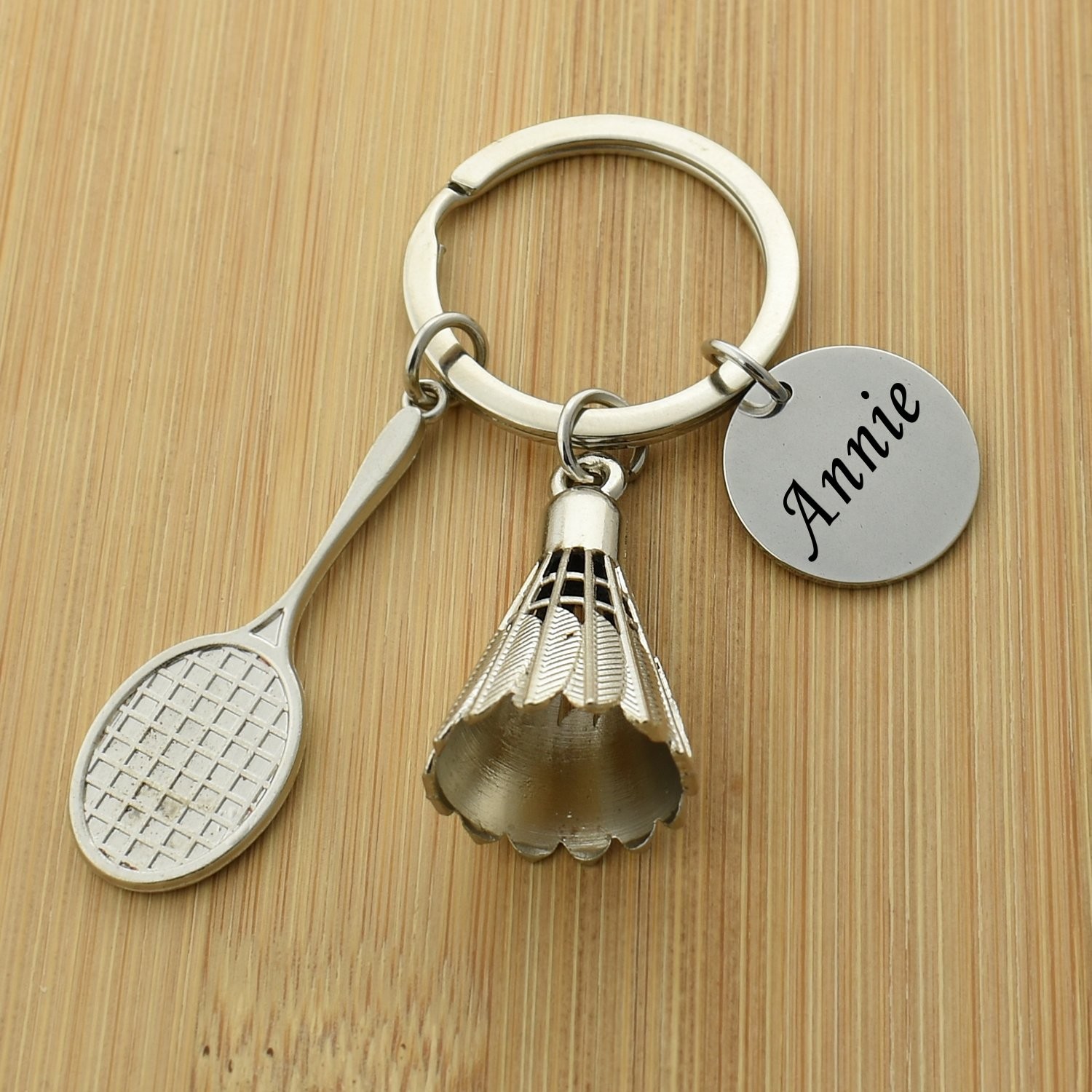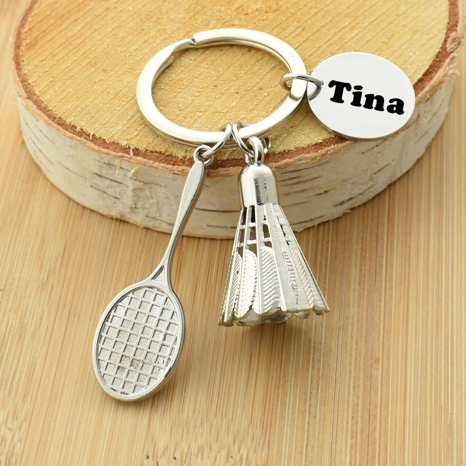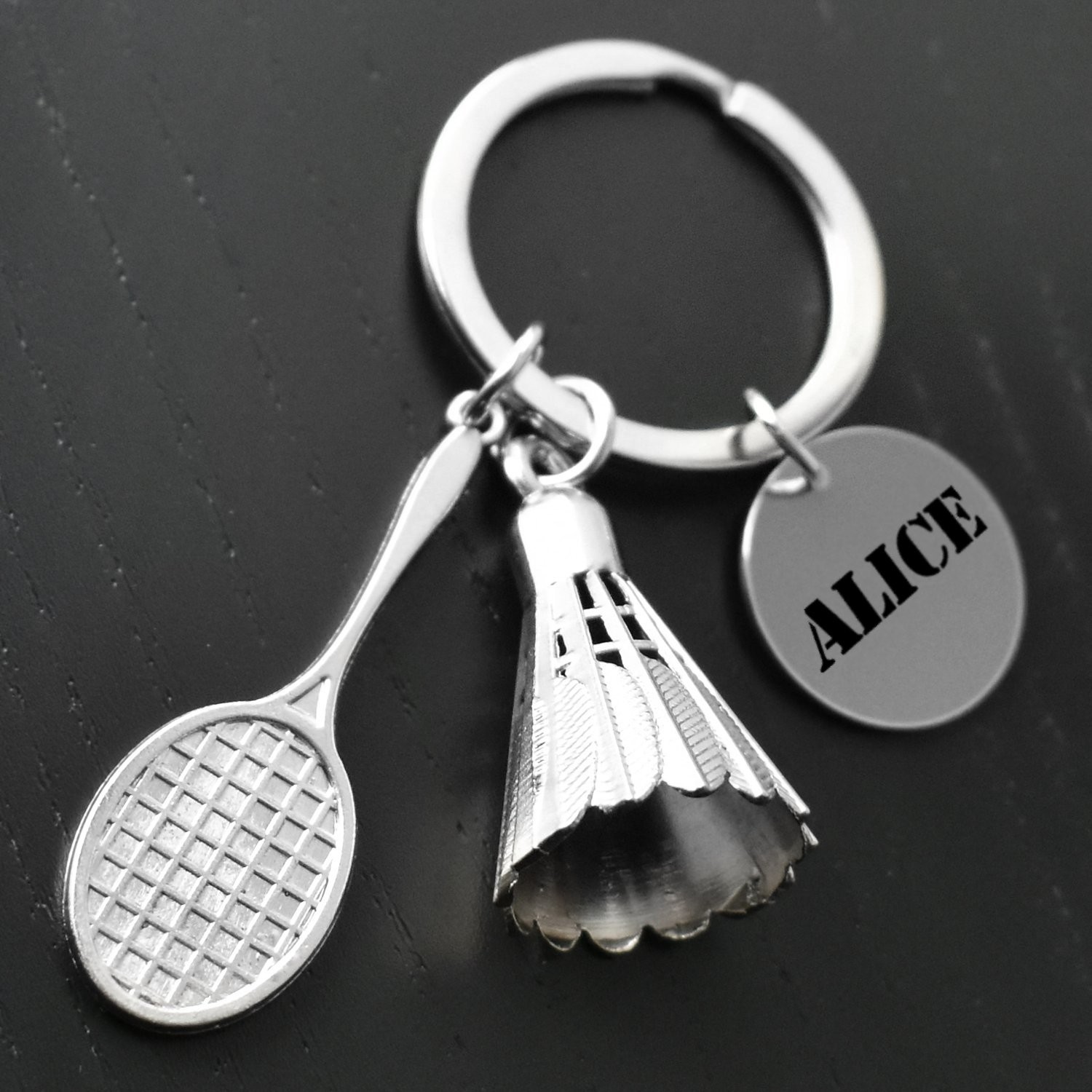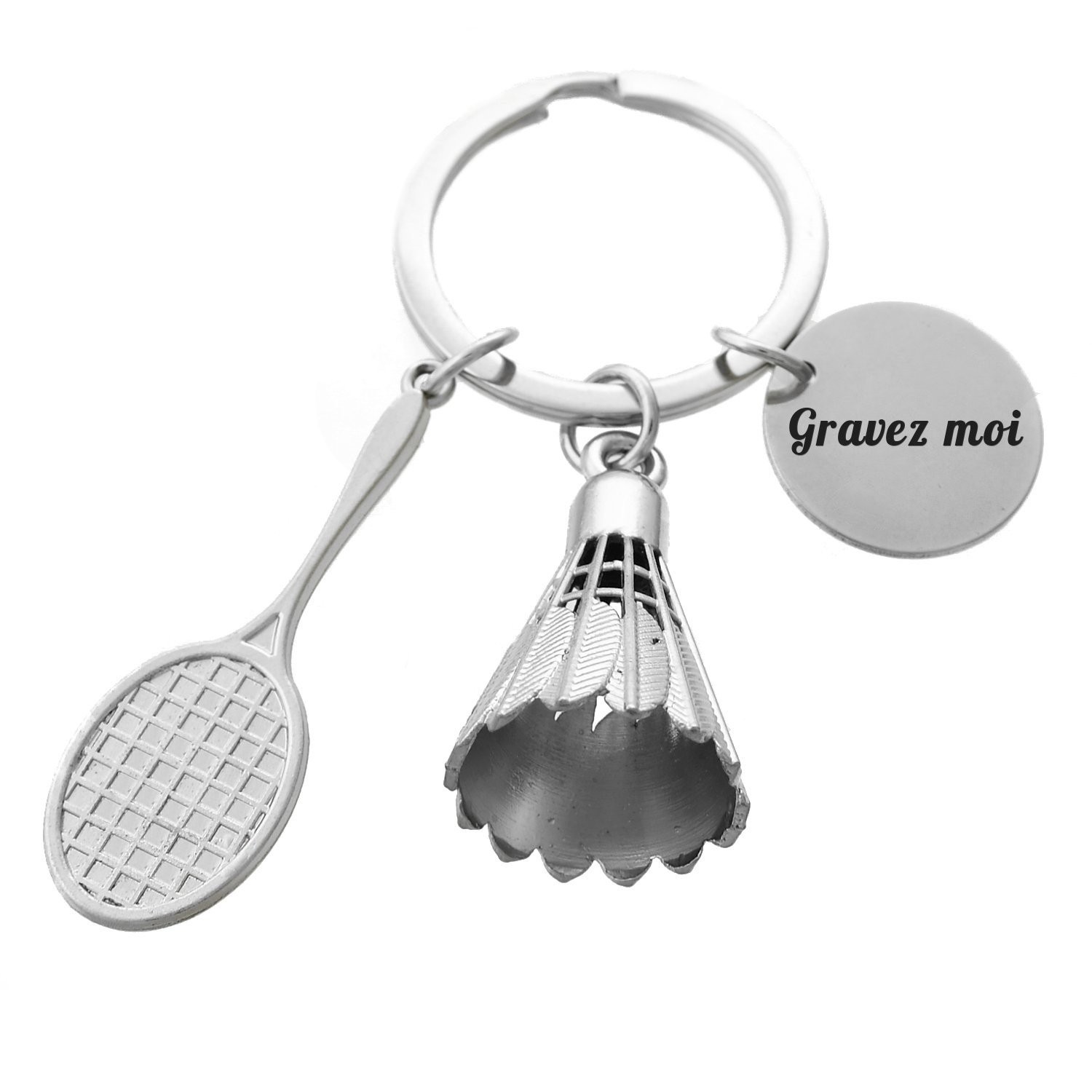 Porte-clés Badminton gravé — Raquette Volant Cadeau Sport Personnalisé Métal Argenté