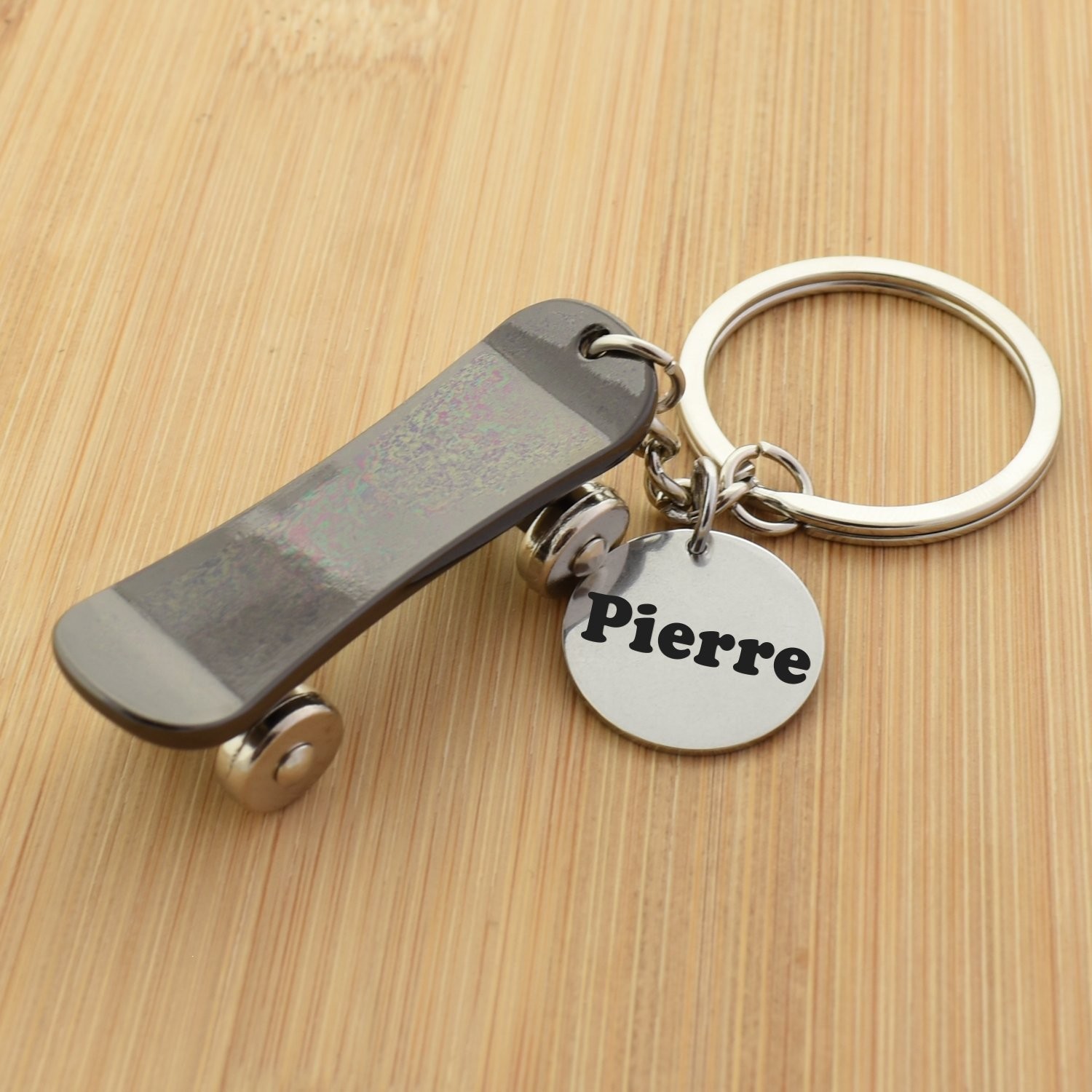 Le pendentif est une miniature réaliste de skateboard en métal finition gunmetal noir irisé — plateau arrondi aux deux extrémités avec deux trucks et quatre roues bien détaillées, montés de façon fonctionnelle sous le plateau. La teinte sombre et métallique lui donne un aspect brut et urbain qui tranche avec les porte-clés argentés classiques. L'ensemble est monté directement sur l'anneau porte-clés standard avec la médaille gravable suspendue à côté. Le métal résiste bien aux chocs et à l'usure du quotidien sans se déformer.
