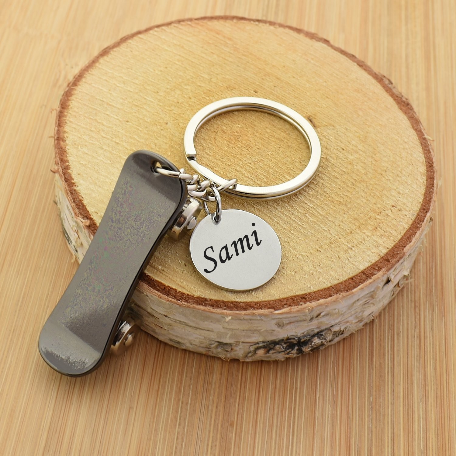 La médaille ronde suspendue sur l'anneau est là pour accueillir le texte de ton choix. On peut y graver "Théo", "No Fear" ou "2025" — une dizaine de caractères pour un rendu net et lisible. La gravure est réalisée au laser : trait précis, permanent, qui ne s'efface pas avec le temps. Un prénom seul fonctionne très bien, mais un surnom de rue ou une date mémorable donnent encore plus de caractère au cadeau.