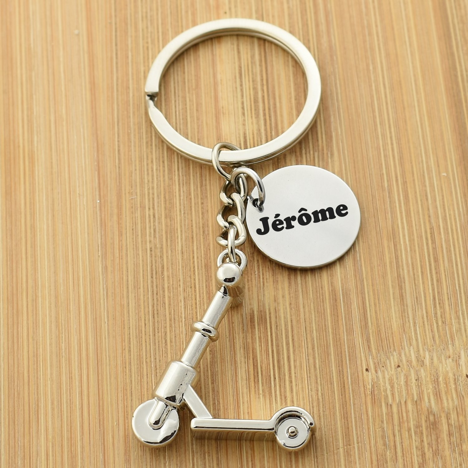 Le pendentif représente une trottinette à deux roues en métal chromé brillant — guidon, potence, plateau et roues finement détaillés en miniature 3D, avec un réalisme saisissant pour sa taille. La finition chromée très polie lui donne un aspect soigné et solide, bien différent des pendentifs plats classiques. L'ensemble est monté sur un anneau porte-clés standard avec chaîne intermédiaire et médaille gravable accrochée à côté. Le métal résiste bien aux chocs, aux frottements et à l'usure du quotidien sans ternir.
