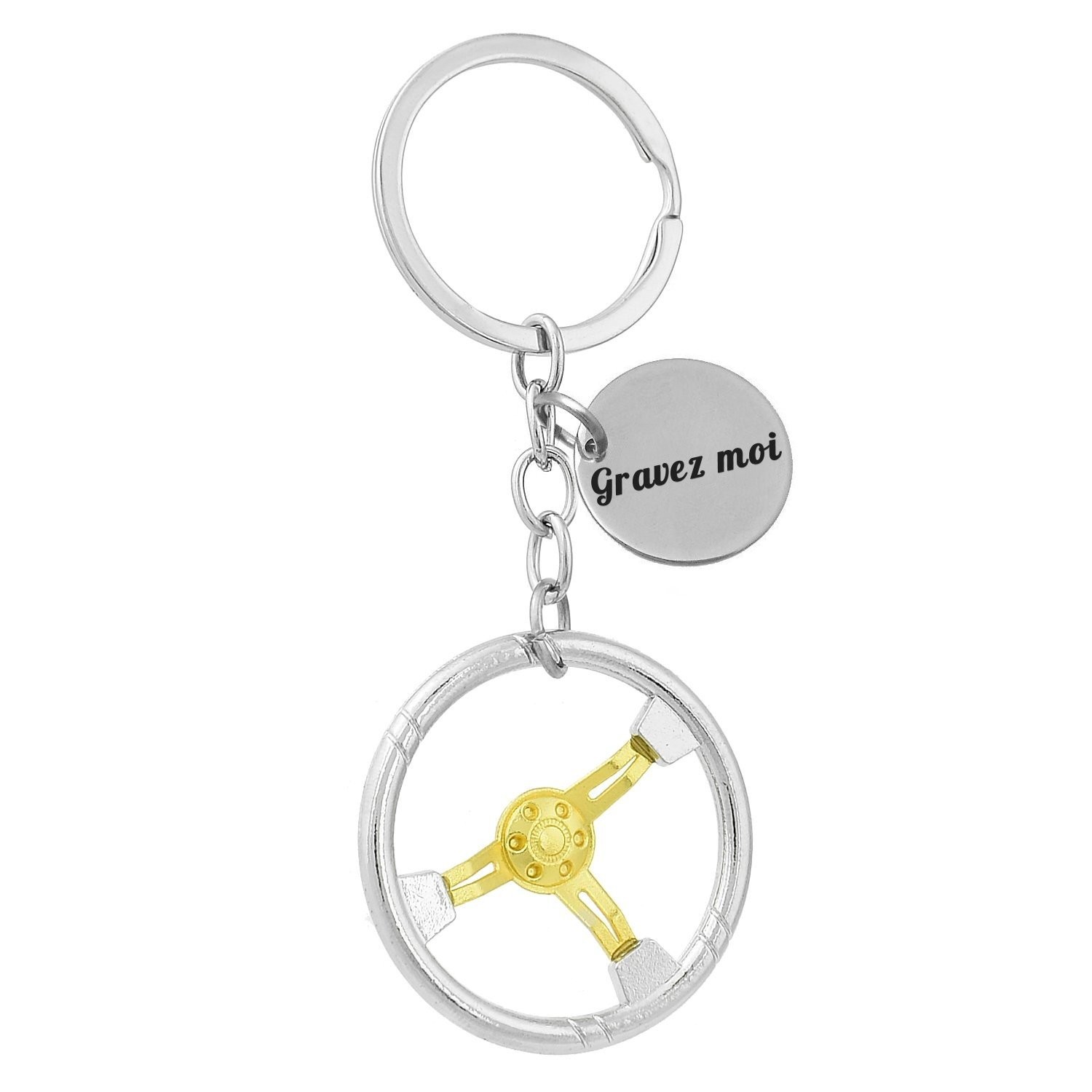 Le pendentif représente un volant de sport en métal chromé argenté — jante avec coutures et poignées bien détaillées, et branches à trois rayons en finition dorée brillante avec moyeu central en relief. Ce contraste argent et or lui donne un rendu soigné et original, entre élégance sportive et accessoire de prestige. L'ensemble est monté sur un anneau porte-clés standard avec chaîne intermédiaire et médaille gravable accrochée à côté. Le métal résiste bien aux frottements et à l'usure du quotidien sans ternir.